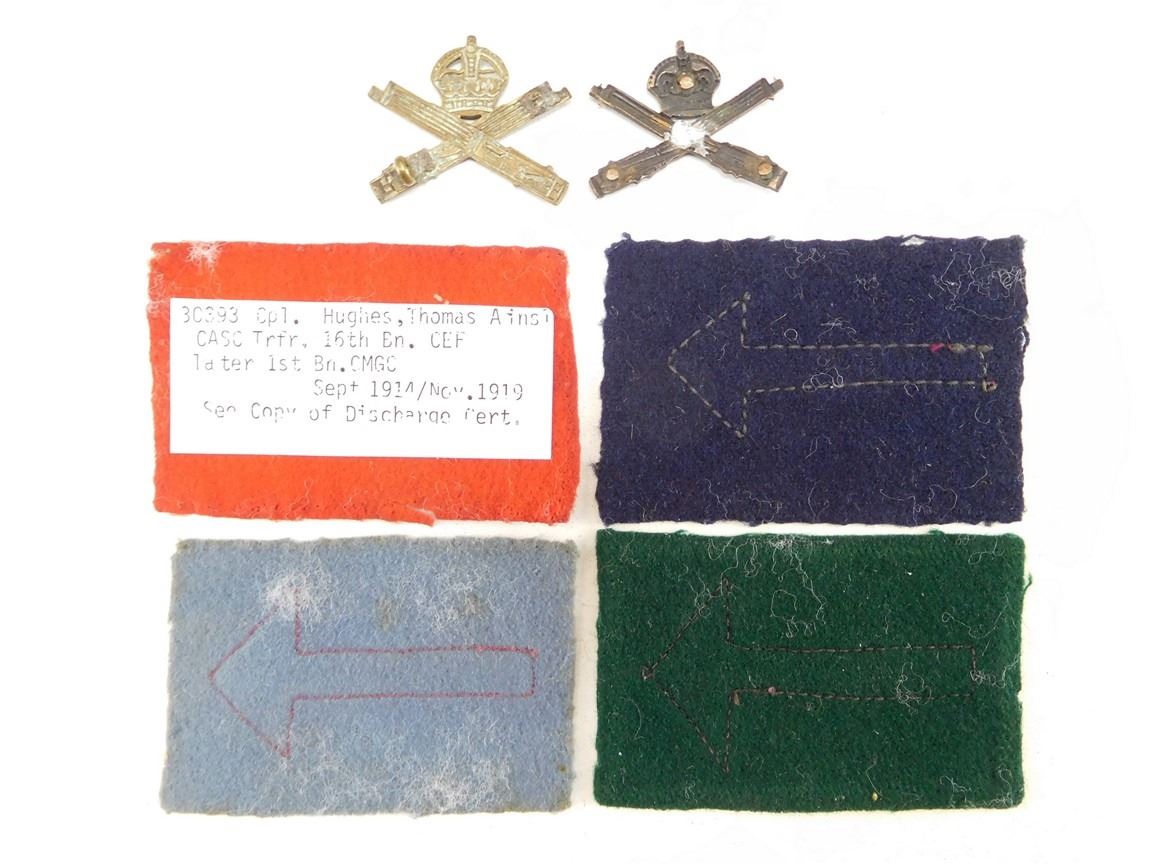 LABELED FROM CPL. HUGHES, THOMAS AINSL CASC TRFR, 16TH BN CEF, THEN 1ST BN CMGC SEPT 1914/NOV 1919, INCLUDES 1ST THROUGH 4TH BATTALIONS PLUS HAT BADGES WITH MOST LUGS MISSING