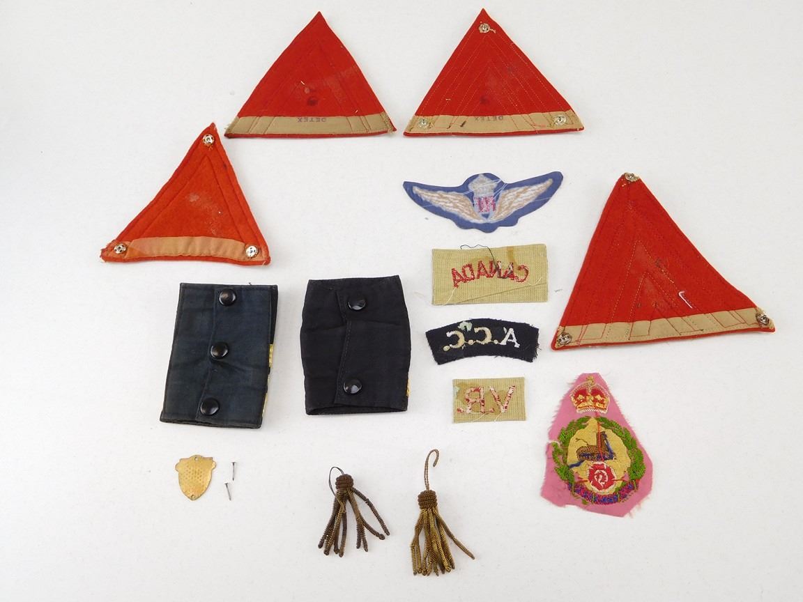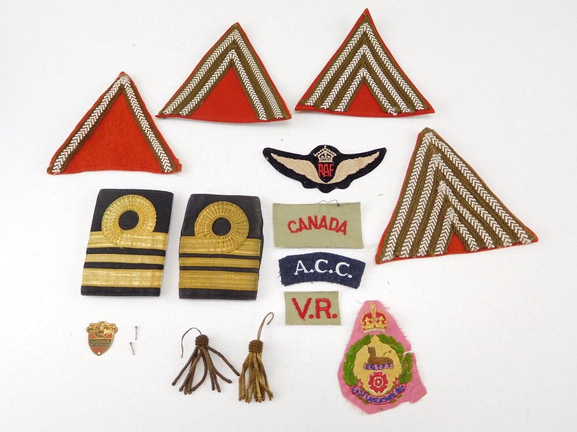 ASSORTED RANK BADGES, EAST LANCASHIRE REGT BADGE, RAF BADGE, ACC, V.R. SHOULDER BADGES,