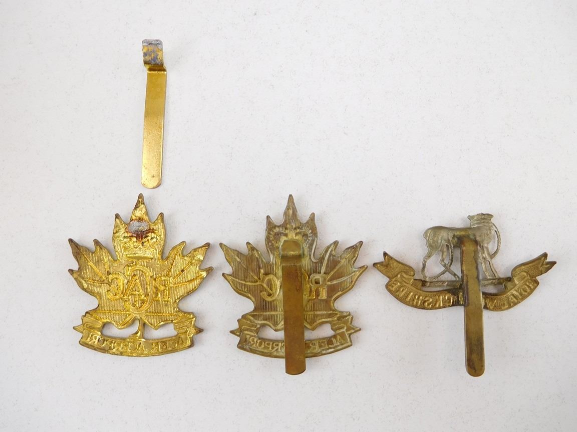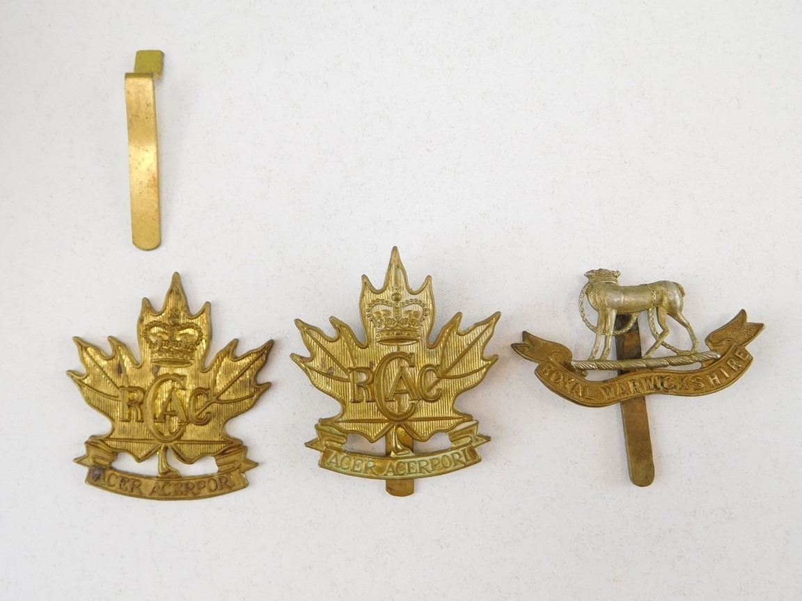 (2) R.C.A.C. SLIDE FASTENERS (1 IS BROKEN), (1) ROYAL WARWICKSHIRE HAT BADGE (HEAD IS MISSING) SLIDE FASTENER, LOT OF 3