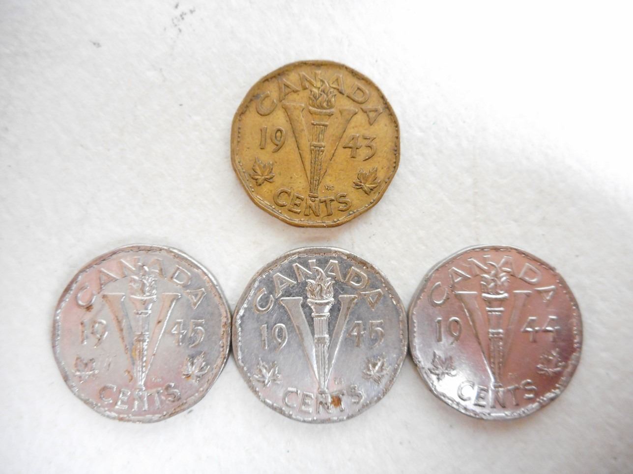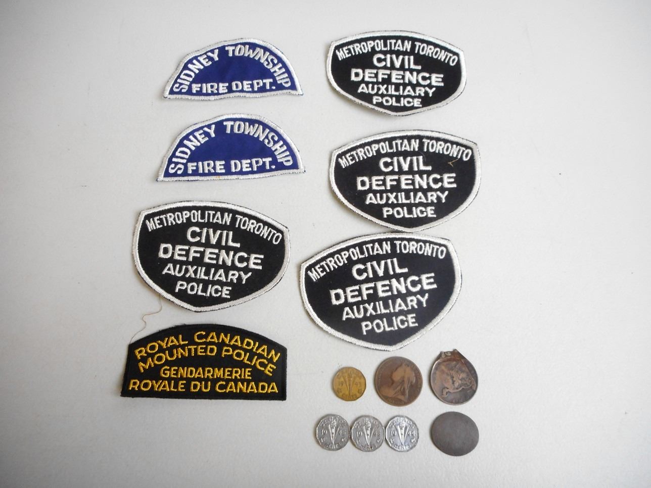 (4) METROPOLITAN TORONTO CIVIL DEFENSE AUXILIARY POLICE , (1) RCMP, (2) SIDNEY TOWNSHIP FIRE DEPT. PLUS ASSORTED COINS: CANADA 1945 & ONE PENNY 1889 & 1899