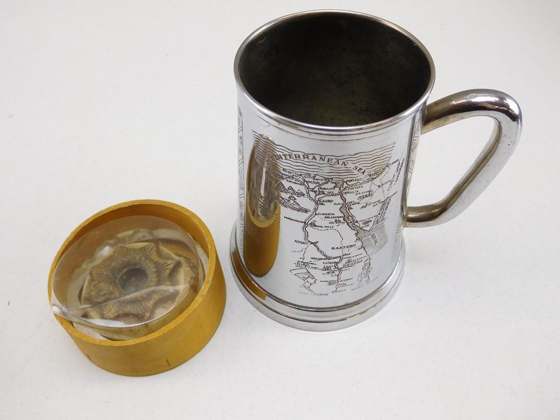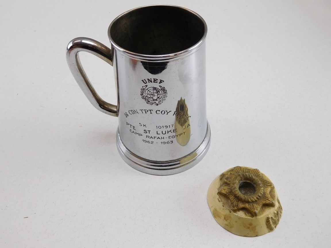 (1) UNEF MUG, CLEAR BOTTOMED, ENGRAVED 56 CDN TPT COY RCASC SK 101917 PTE ST LUKE JA CAMP RAFAH-EGYPT 1962-1963, (1) UNKNOWN PIECE