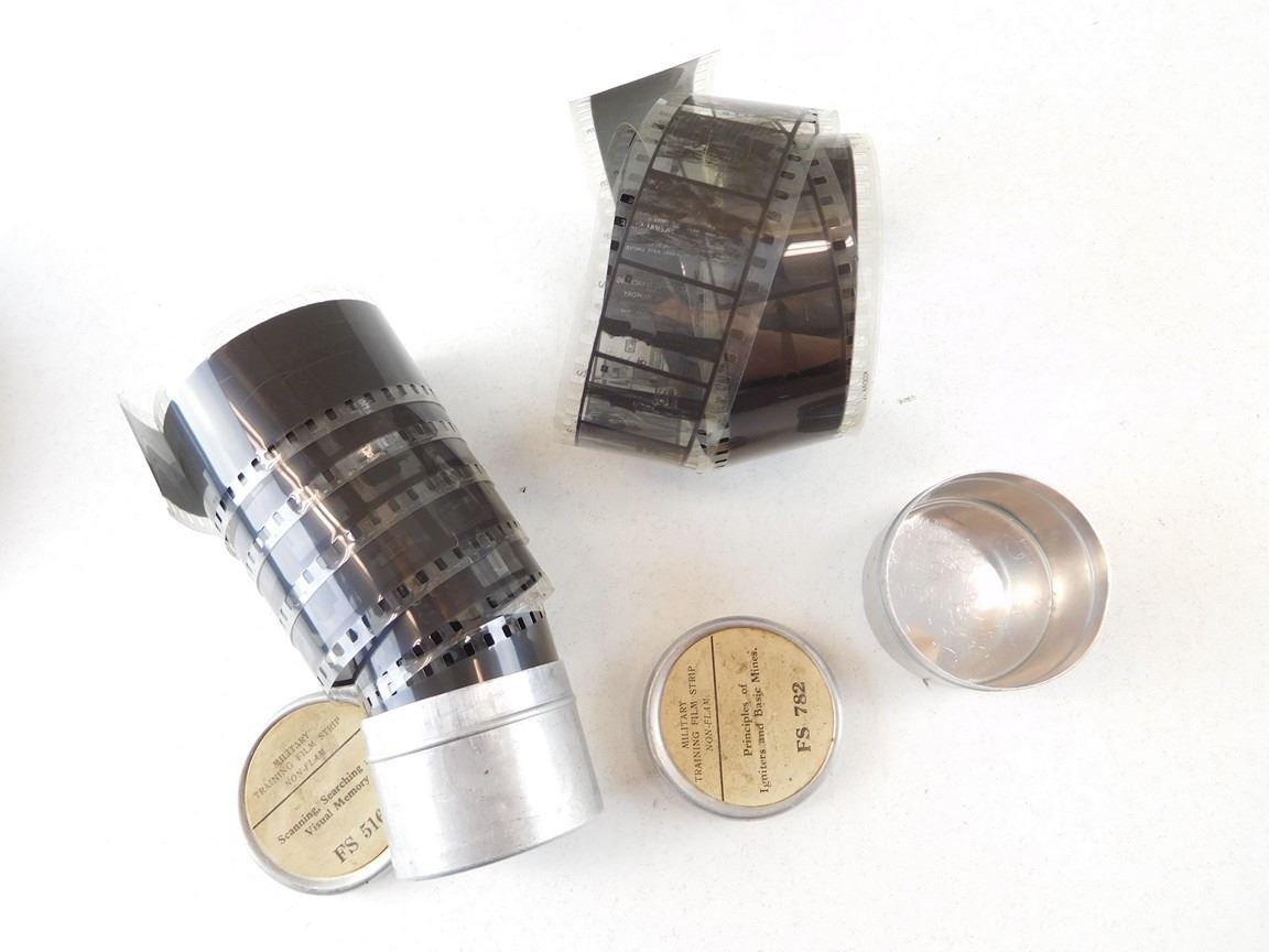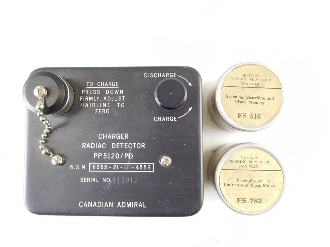 (2) MILITRAY TRAINING FILM STRIPS: SCANNING, SEARCHING & VISUAL MEMORY; PRINCIPLES OF IGNITERS AND BASIC MINES, (1) CHARGER RADIAC DETECTOR CANADIAN ADMIRAL