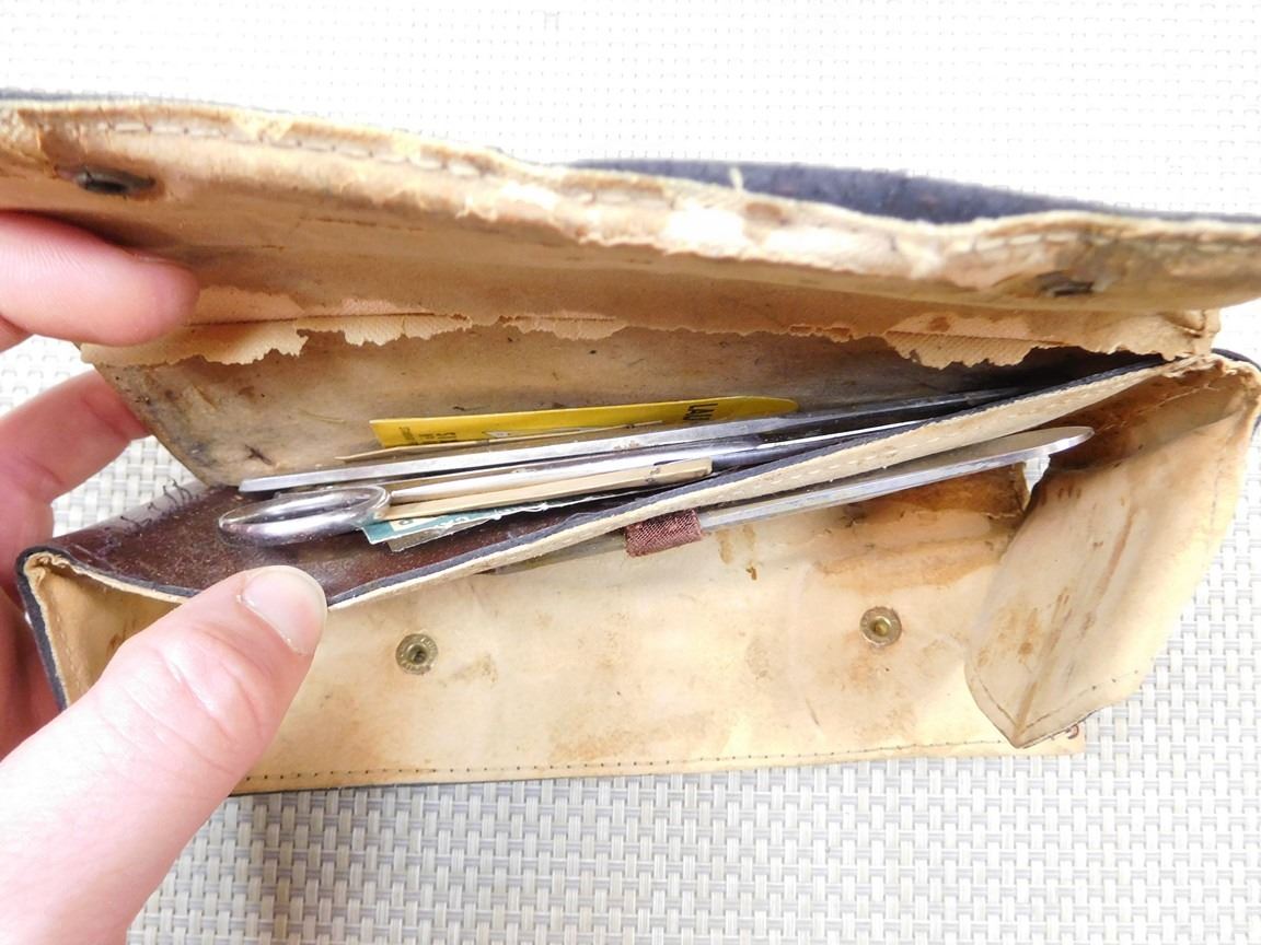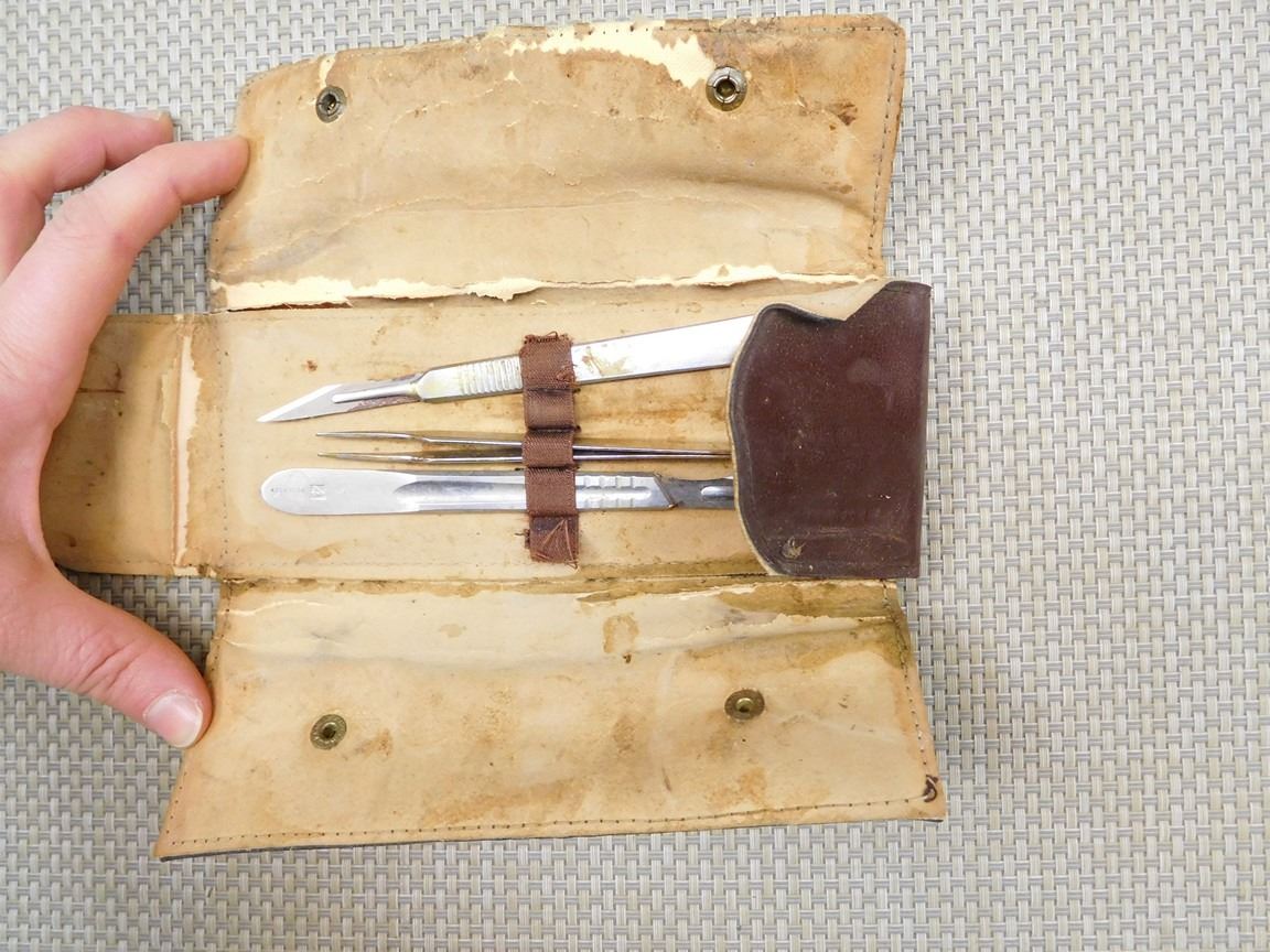 (1) RUSSIAN BELT DATED 1978, (1) SURGICAL KIT INCLUDES SCAPELS, FORCEPTS AND MORE, LEATHER IS CRACKING