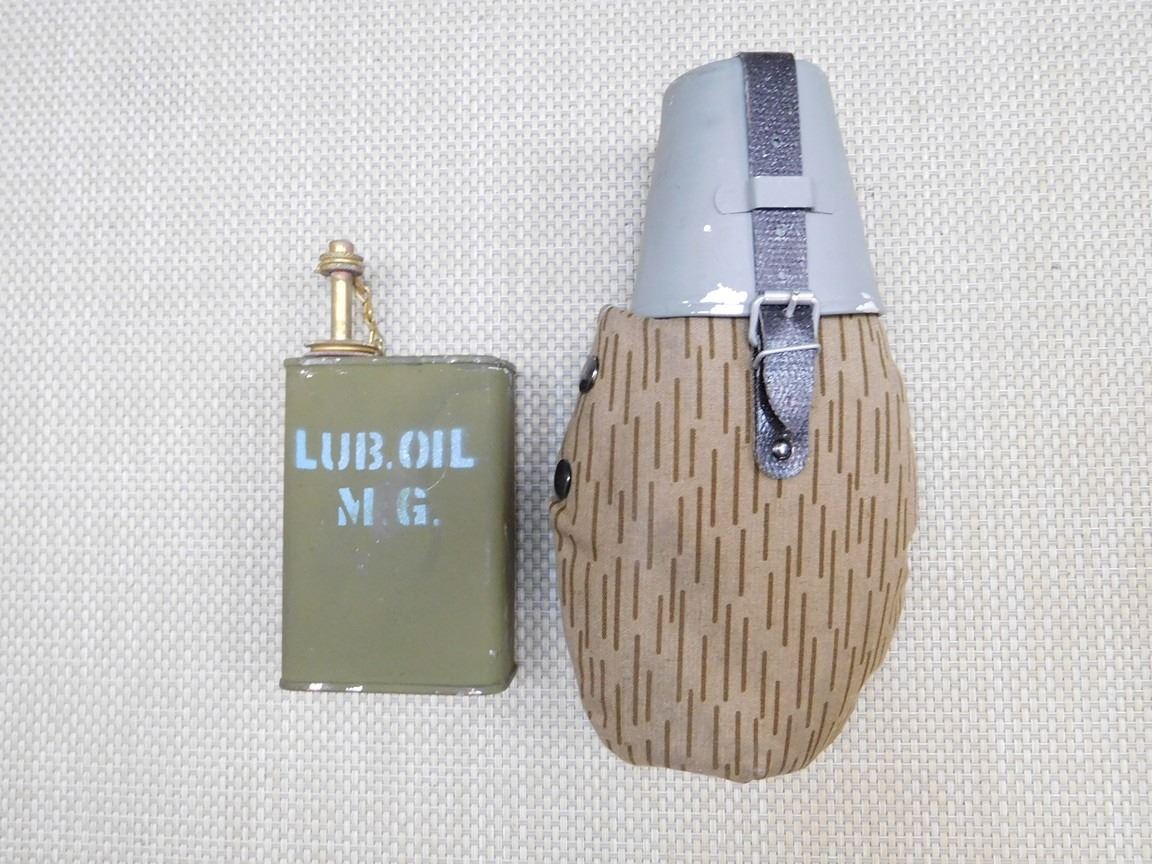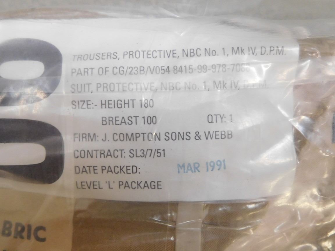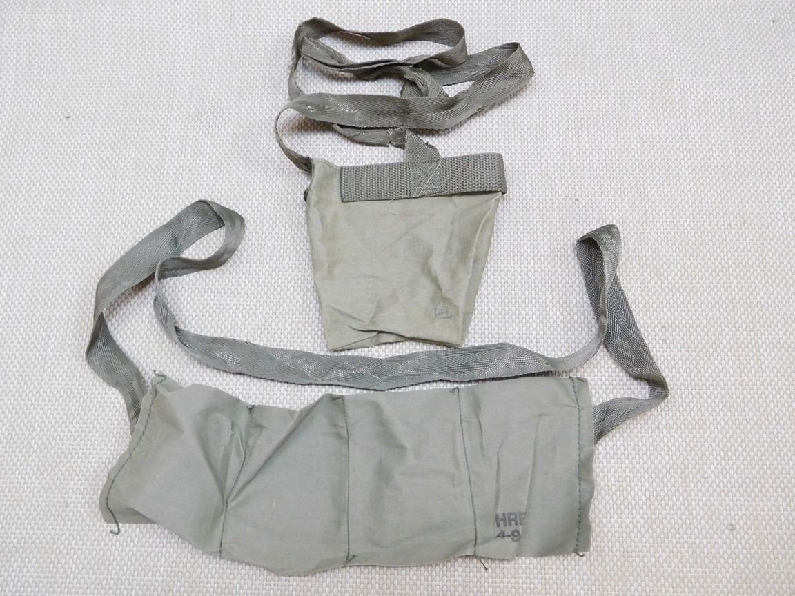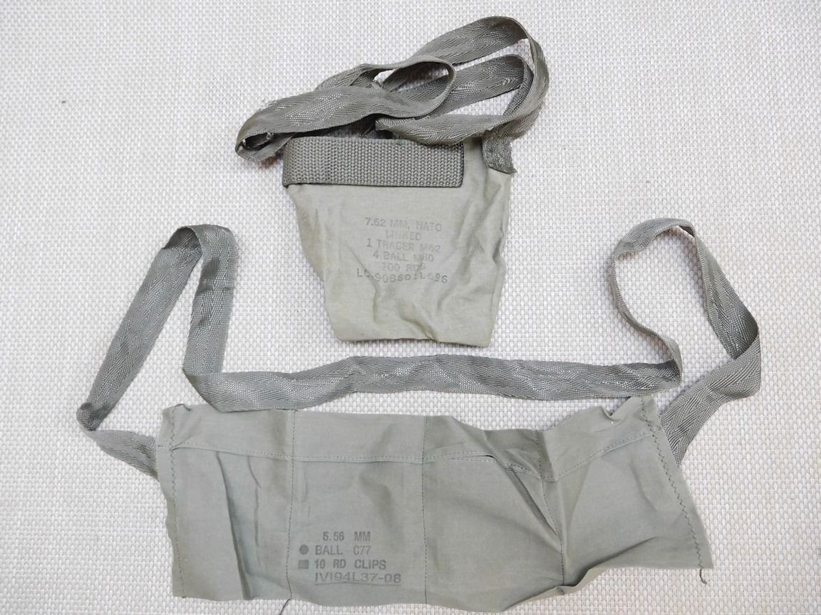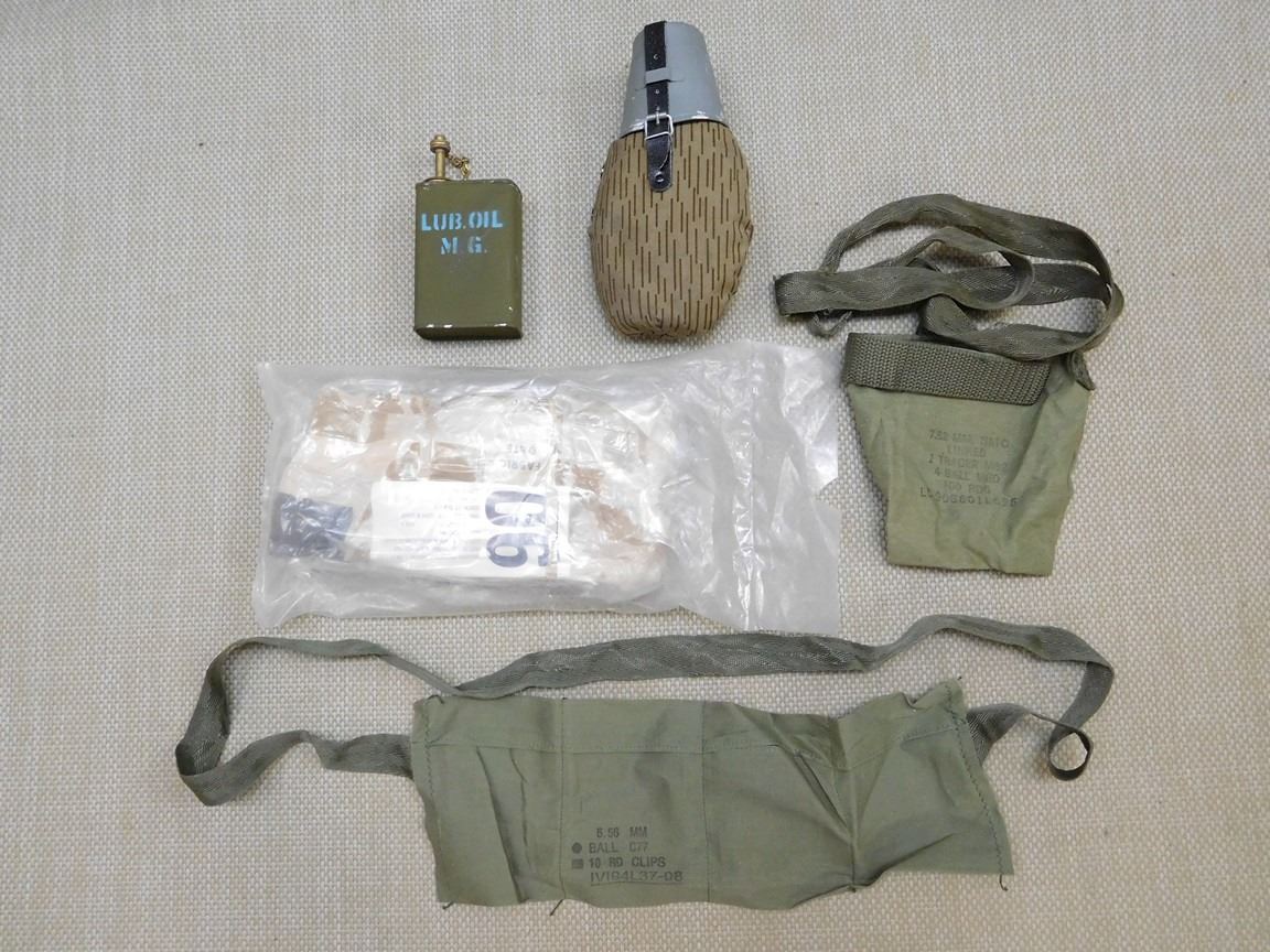 (2) AMMO POUCHES: (1) MARKED 5.56MM CALL C77 10 RND CLIPS, (1) MARKED 7.62 MM, NATO LINKED 1 TRACER M62 4 BALL M80 100 RNDS, (1) PLASTIC CANTEEN, (1) MACHINE GUN OILER/CAN LUB. OIL M.G., (1) VACCUM SEALED MILITARY CLOTHES MARKED: 06 TROUSERS, PROTECTICE, NBC NO. 1, MK IV, D.P.M. ... FABRIC DATE DEC 1990, DATE PACKED MAR 1991 LEVEL 'L' PACKAGE