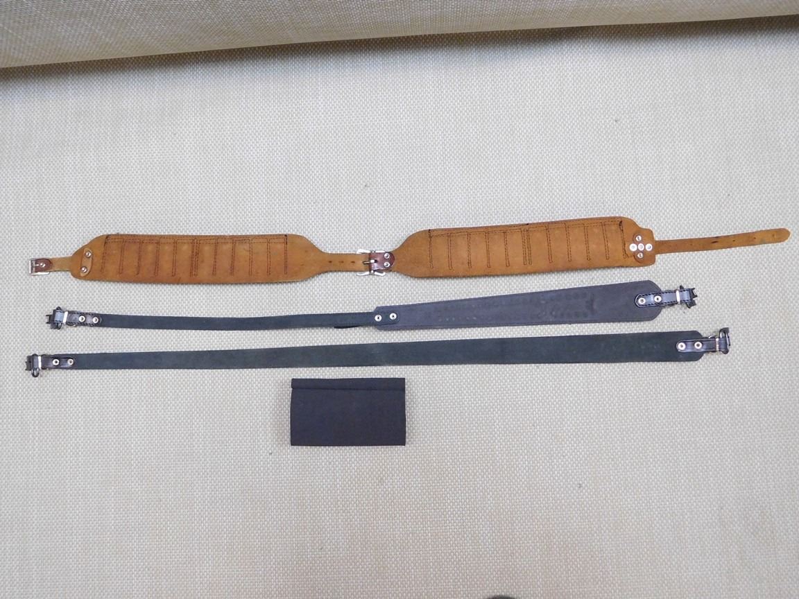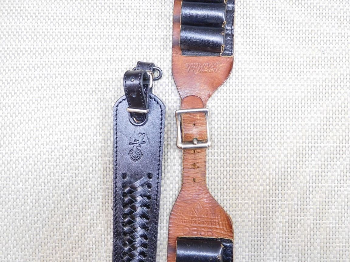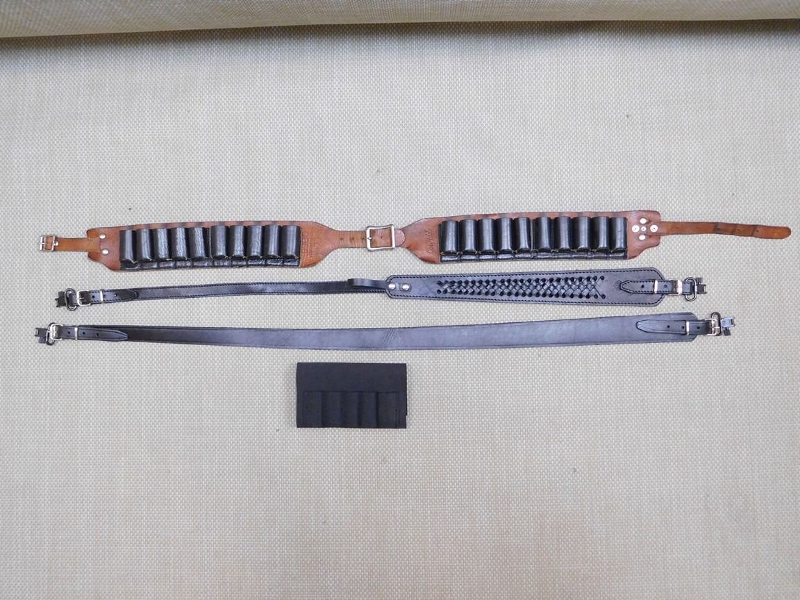 (1) LEATHER AMMO BELT, (2) BLACK LEATHER RIFLE SLINGS, WITH UNCLE MIKES SLING RINGS, (1) AMMO SLEEVE, LOT OF 4