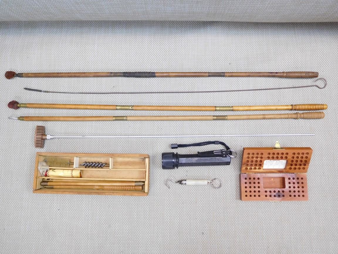INCLUDES WOODEN CLEANING RODS, WOODEN CLEANING KIT, WOODEN AMMO BOX, FLASHLIGHT, SMALL HOOK SCALE