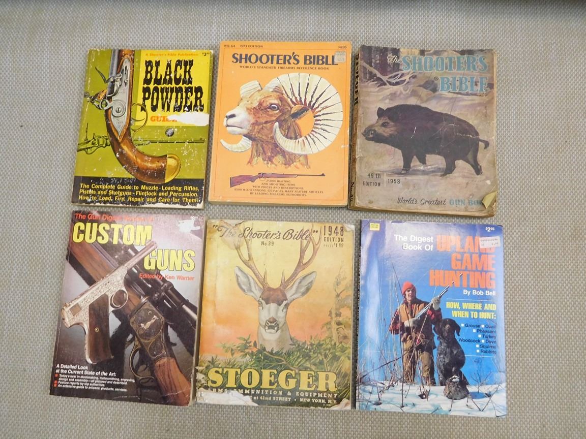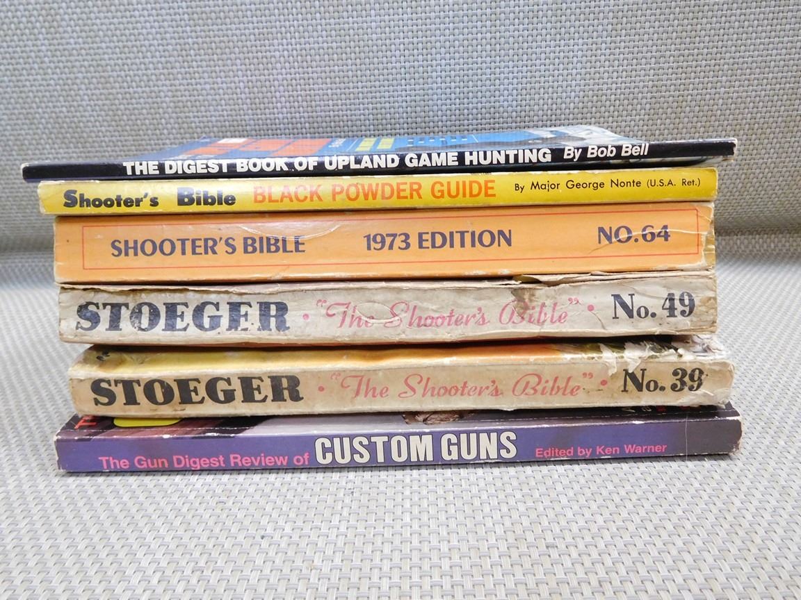 (4) SHOOTER'S BIBLES # 39, 49, 64, & BLACK POWDER GUIDE, (1) GUN DIGEST REVIEW OF CUSTOM GUNS, (1) DIGEST BOOK OF UPLAND GAME HUNTING, LOT OF 6
