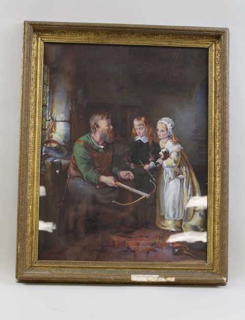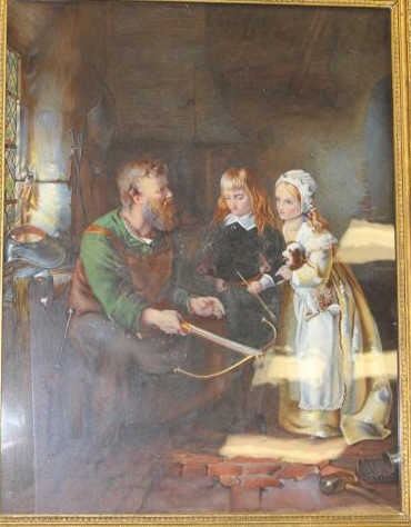 17KT-26 CROSSBOWFinely hand colored lithograph of armor showing crossbow to young squire and young lady holding spaniel puppy. Measures 24” x 18 ½” in same vintage Victorian frame showing damage to gesso and gilt. Est.: $350-$700Finely hand colored lithograph of armor showing crossbow to young squire and young lady holding spaniel puppy. Measures 24” x 18 ½” in same vintage Victorian frame showing damage to gesso and gilt. Est.: $350-$700