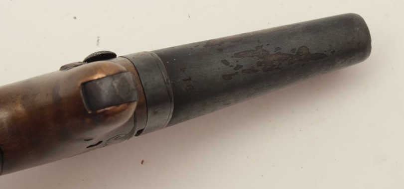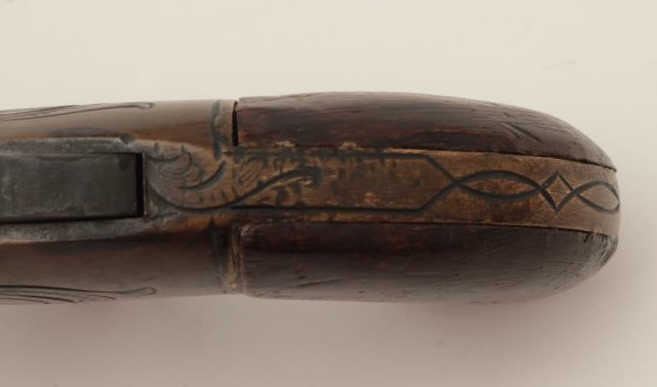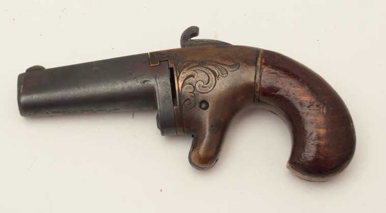 17CJ-13 DERR #416National Derringer, .41 caliber, 2.5” barrel, S/N 416, engraved brass frame, iron barrel, dark bore, action needs work. (Antique). Est.: $300-600National Derringer, .41 caliber, 2.5” barrel, S/N 416, engraved brass frame, iron barrel, dark bore, action needs work. (Antique). Est.: $300-600
