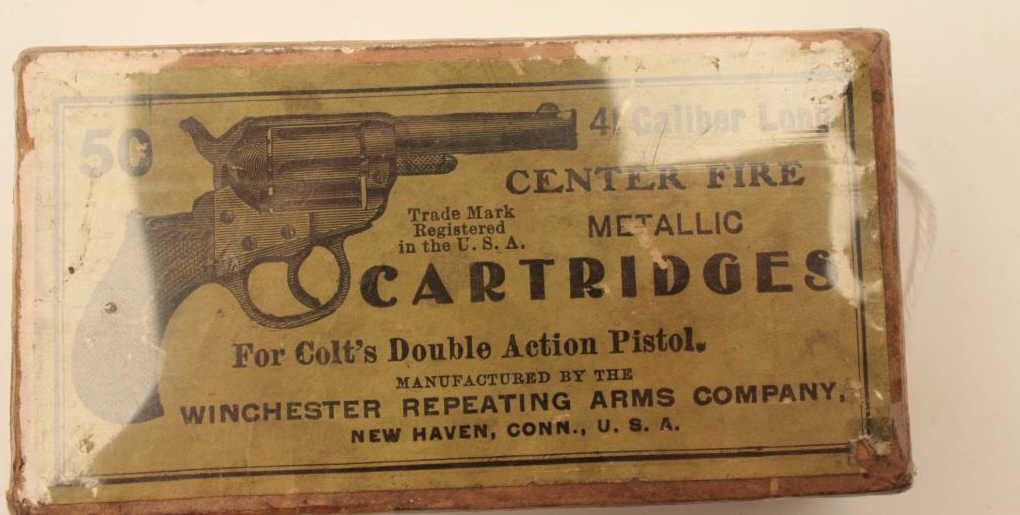 18BJ-6 FULL BOX .41 CALDesirable full “picture” box (picture of Colt Model 1877 Thunderer DA revolver) of Colt .41 caliber long cartridges by Winchester Repeating Arms Co., green and orange label, in overall very good condition. Est.:$400-$800.Desirable full “picture” box (picture of Colt Model 1877 Thunderer DA revolver) of Colt .41 caliber long cartridges by Winchester Repeating Arms Co., green and orange label, in overall very good condition. Est.:$400-$800.