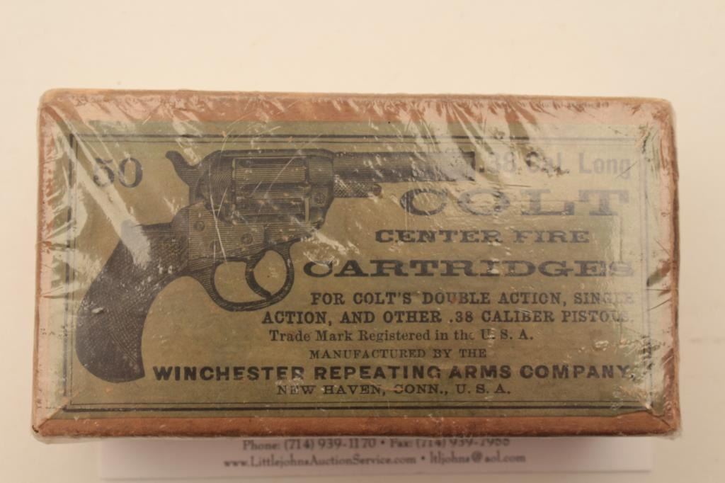 18BJ-8 COLT 1877 AMMODesirable full “picture” box (picture of Colt Model 1877 Lightning DA revolver) of Colt .38 caliber long cartridges by Winchester Repeating Arms Co., green and orange label, in overall very good condition. Est.:$300-$600.Desirable full “picture” box (picture of Colt Model 1877 Lightning DA revolver) of Colt .38 caliber long cartridges by Winchester Repeating Arms Co., green and orange label, in overall very good condition. Est.:$300-$600.