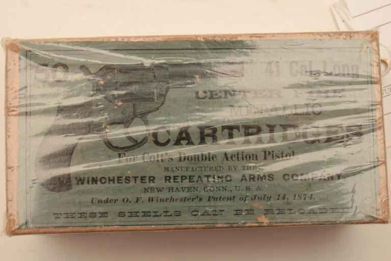 18BJ-9 EARLY FULL BOX OF .41 CAL.Desirable full “picture” box (picture of Colt Model 1877 Thunderer DA revolver) of colt .41 caliber long cartridges by Winchester Repeating Arms Co., blue label, in overall very good to near fine condition withnotation at bottom of label “THESE SHELLS CAN BE RELOADED”. Est.: $400-$800.Desirable full “picture” box (picture of Colt Model 1877 Thunderer DA revolver) of colt .41 caliber long cartridges by Winchester Repeating Arms Co., blue label, in overall very good to near fine condition withnotation at bottom of label “THESE SHELLS CAN BE RELOADED”. Est.: $400-$800.