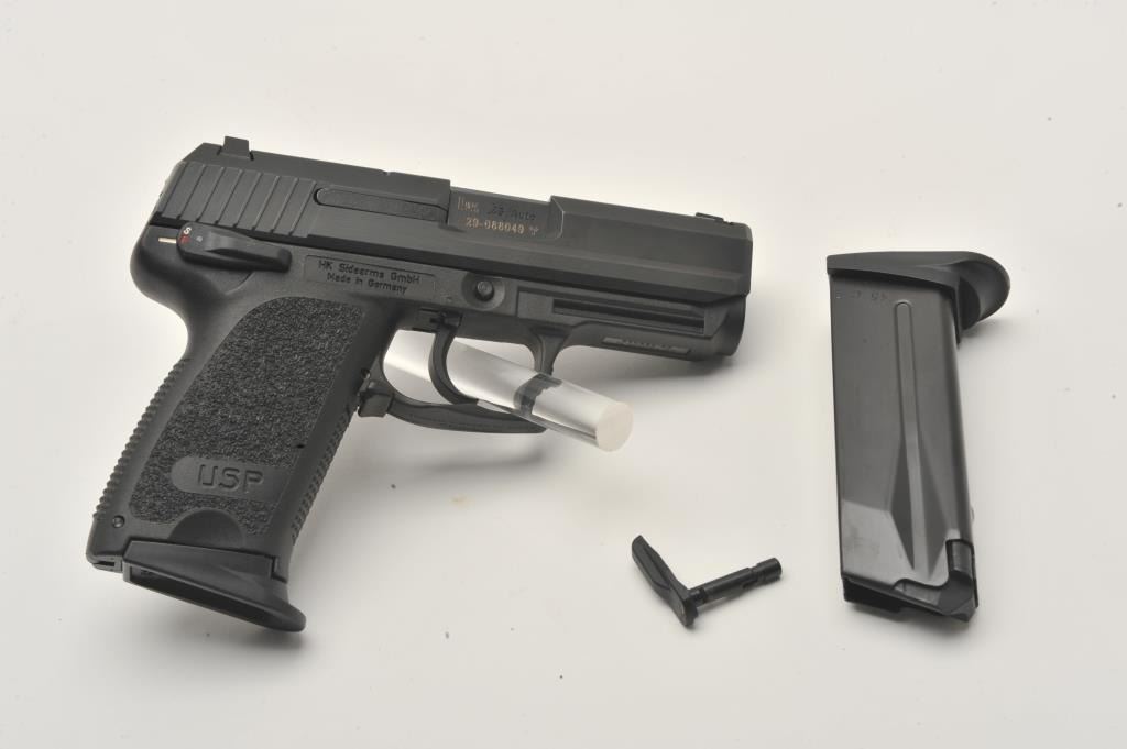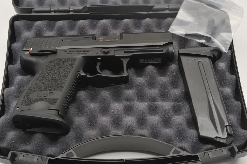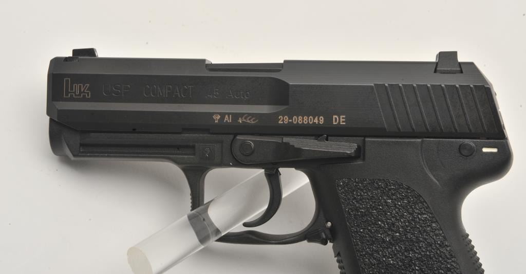 18EMY-19 H&K USP COMPACT PISTOLH&K USP Compact semi-automatic pistol, .45 caliber, black finish, S/N 29-088049, with one extra magazine, instructions manual and factory padded hardcase and end label numbered to this gun. Pistol is in like newcondition and set up with a left hand de-cocker lever (right hand de-cocker lever also included). (Modern/PPT). Est.: $500-$900.H&K USP Compact semi-automatic pistol, .45 caliber, black finish, S/N 29-088049, with one extra magazine, instructions manual and factory padded hardcase and end label numbered to this gun. Pistol is in like newcondition and set up with a left hand de-cocker lever (right hand de-cocker lever also included). (Modern/PPT). Est.: $500-$900.