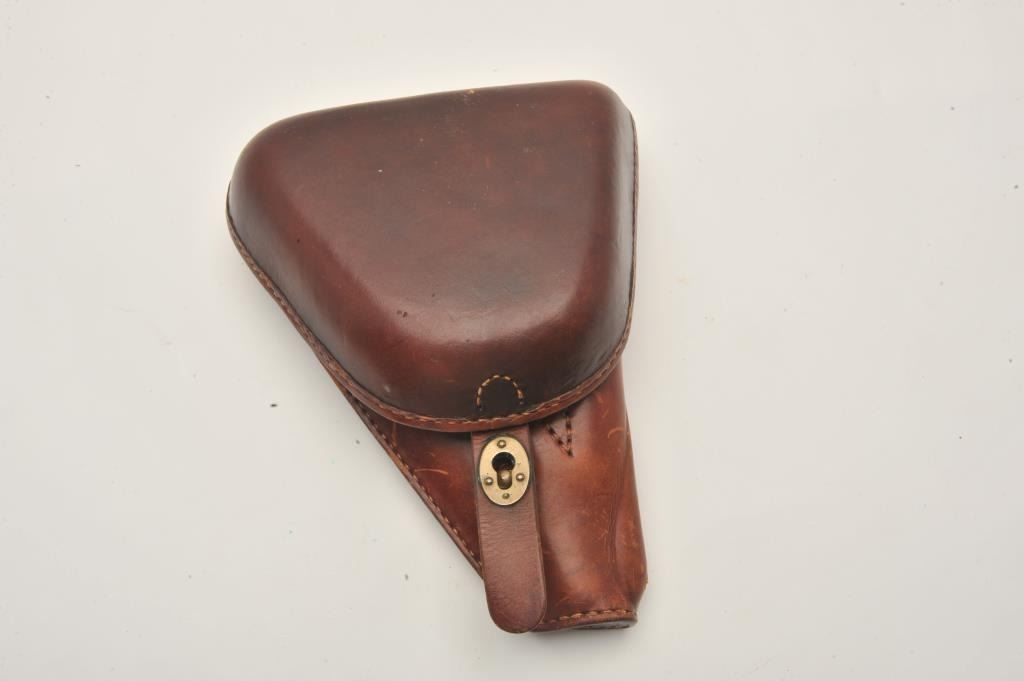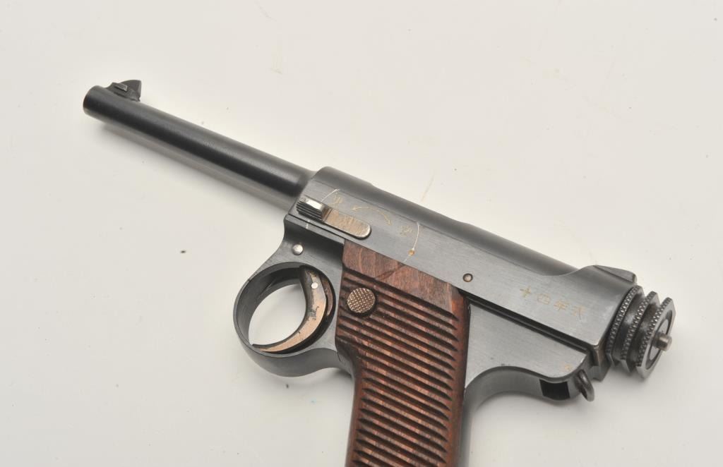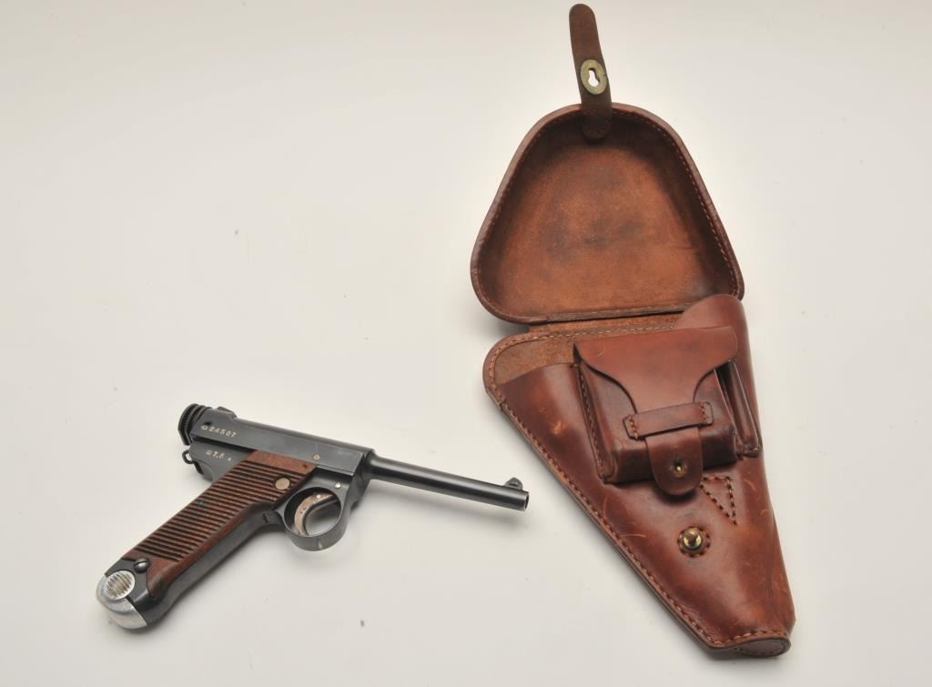 17MH-2 NAMBU #24507Japanese Nambu Type 14 small guard semi-automatic pistol, 8mm caliber, blued finish, wood grips, S/N 24507, with one extra magazine, leather “clamshell” flap holster and two packs of ammo. This gun is inoverall very good to near fine condition displaying the majority of its military finish, very good + bore, crisp action and markings and very good grips. The holster is in good condition. (C&R/PPT). Est.: $600-$1,200.Japanese Nambu Type 14 small guard semi-automatic pistol, 8mm caliber, blued finish, wood grips, S/N 24507, with one extra magazine, leather “clamshell” flap holster and two packs of ammo. This gun is inoverall very good to near fine condition displaying the majority of its military finish, very good + bore, crisp action and markings and very good grips. The holster is in good condition. (C&R/PPT). Est.: $600-$1,200.