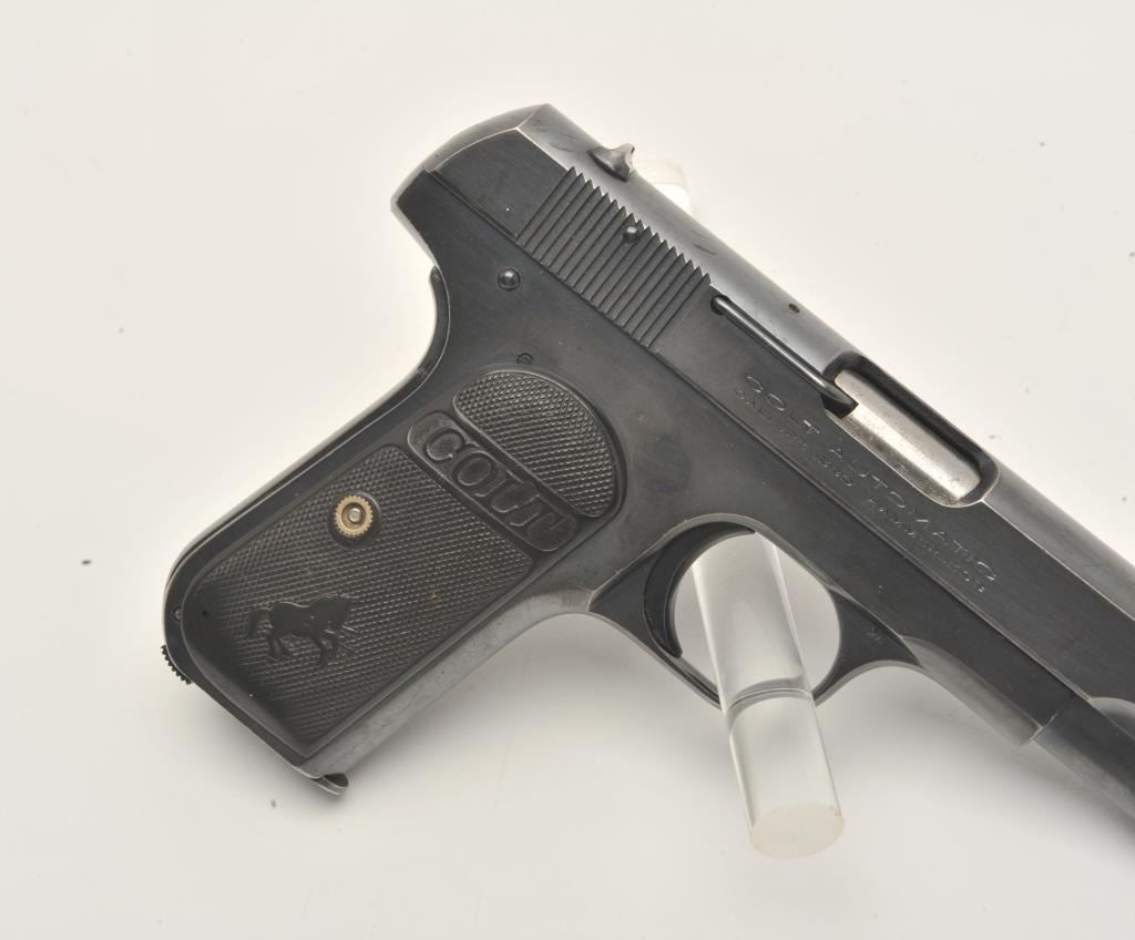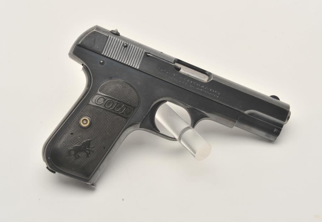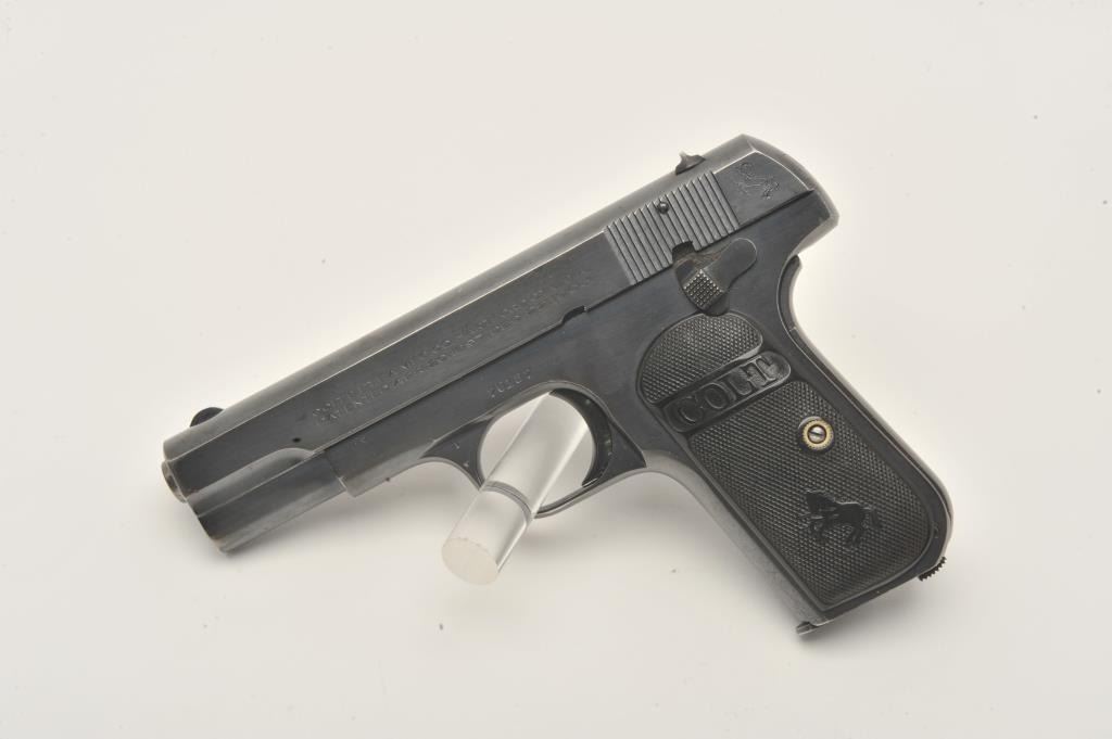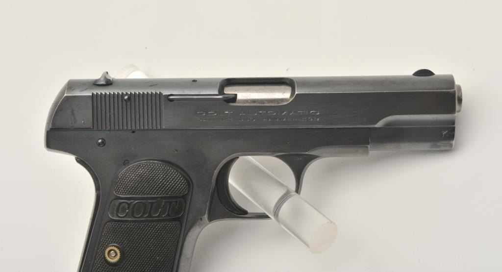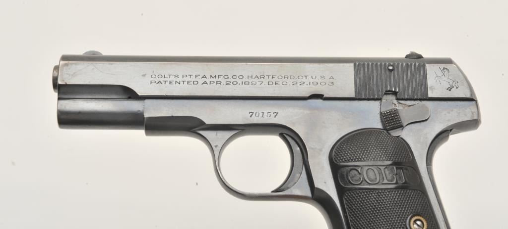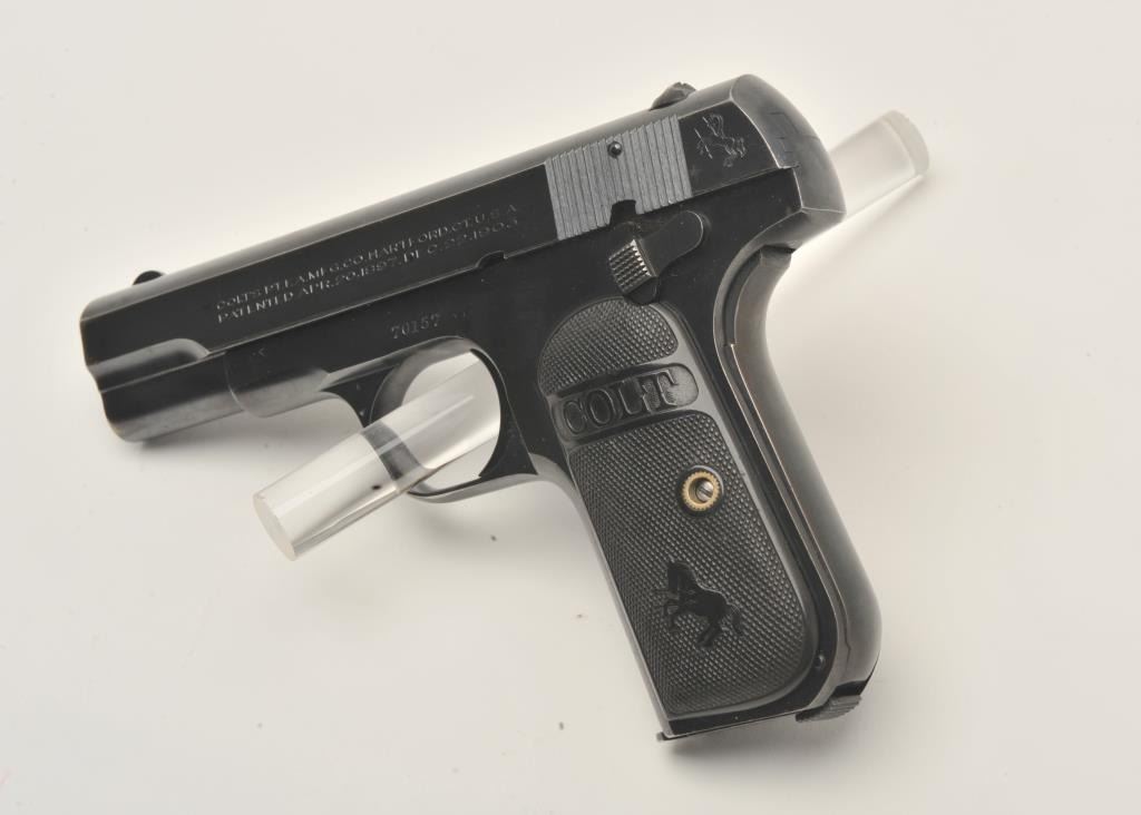 17MH-4 COLT 1908 #70157Colt Model 1908 Pocket semi-automatic pistol, .380 caliber, blued finish, checkered black hard rubber grips, two-tone magazine, S/N 70157, in overall very good to fine condition with majority of original finish, very goodbore, crisp action, sharp markings, very good grips. (C&R/PPT). Est.: $700-$1,400.Colt Model 1908 Pocket semi-automatic pistol, .380 caliber, blued finish, checkered black hard rubber grips, two-tone magazine, S/N 70157, in overall very good to fine condition with majority of original finish, very goodbore, crisp action, sharp markings, very good grips. (C&R/PPT). Est.: $700-$1,400.