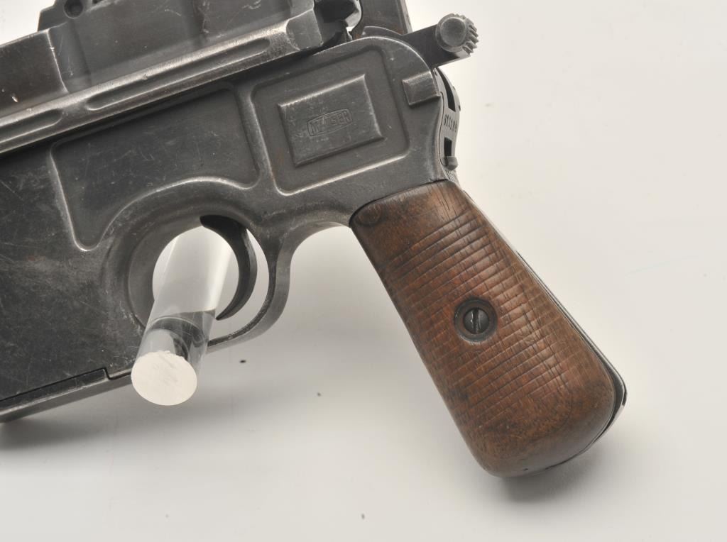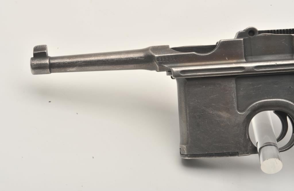 17MH-9 MAUSER C96 #611184Banner Mauser C96 semi-automatic pistol, 7.63mm caliber, military finish, grooved wood grips, cut for shoulder stock (no stock included), S/N 611184, in overall good condition with areas of muted blued finish,good bore, good action, good markings and good grips. (C&R/PPT). Est.: $600-$1,200.Banner Mauser C96 semi-automatic pistol, 7.63mm caliber, military finish, grooved wood grips, cut for shoulder stock (no stock included), S/N 611184, in overall good condition with areas of muted blued finish,good bore, good action, good markings and good grips. (C&R/PPT). Est.: $600-$1,200.