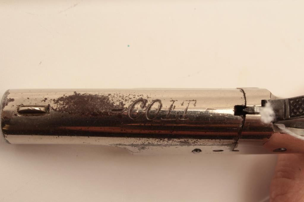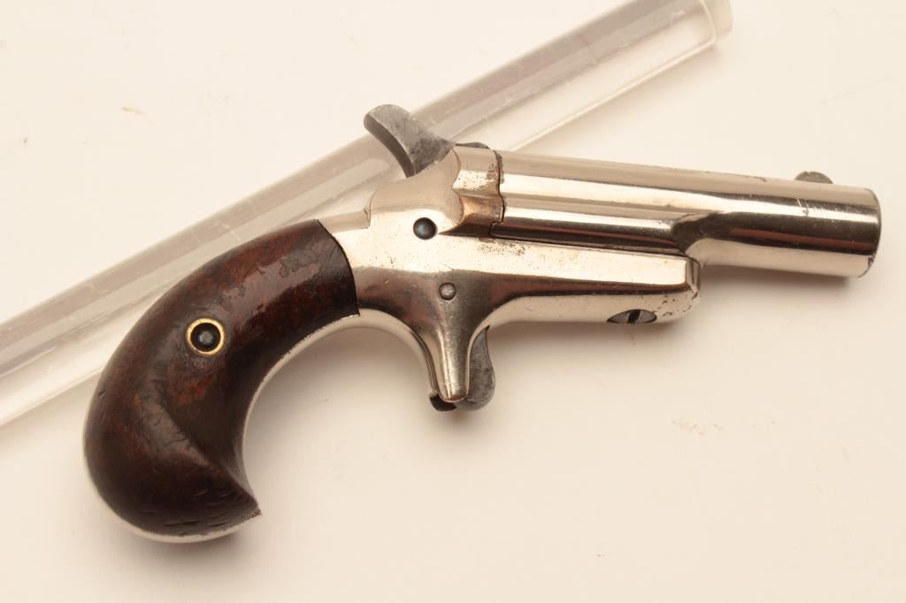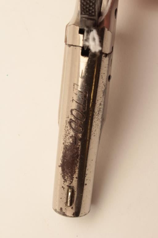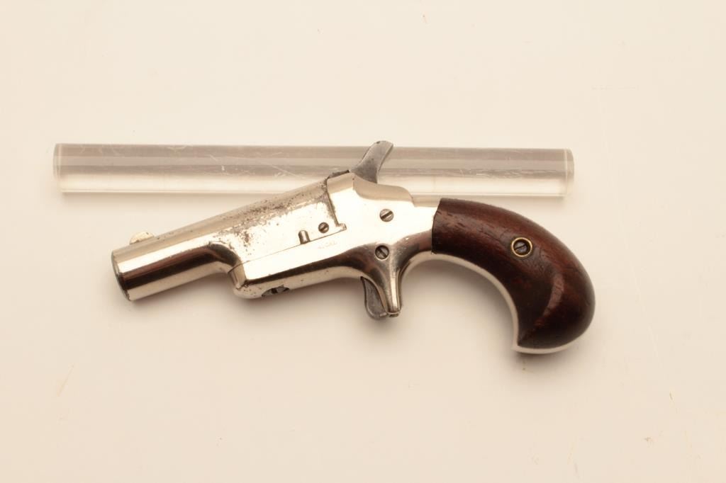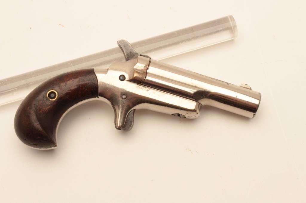 18BL-4 COLT THIRD MDL DERRINGERColt Third Model Derringer, .41 caliber, serial #NSNV. The pistol is in very good overall condition with a 2” polished nickel barrel and frame. The barrel retains the majority of its nickel finish some loss offinish on top and a silver blade front sight. The frame retains a significant amount of its finish with muted blue on the screw heads and toning case hardening on the hammer. The smooth wood grips are in good conditionwith small mars and scrapes from carry and use. The bore is good, the action crisp and markings are sharp. Est.: $900-$1,800. (Antique).Colt Third Model Derringer, .41 caliber, serial #NSNV. The pistol is in very good overall condition with a 2” polished nickel barrel and frame. The barrel retains the majority of its nickel finish some loss offinish on top and a silver blade front sight. The frame retains a significant amount of its finish with muted blue on the screw heads and toning case hardening on the hammer. The smooth wood grips are in good conditionwith small mars and scrapes from carry and use. The bore is good, the action crisp and markings are sharp. Est.: $900-$1,800. (Antique).