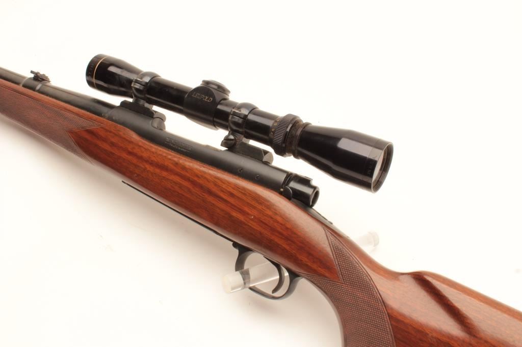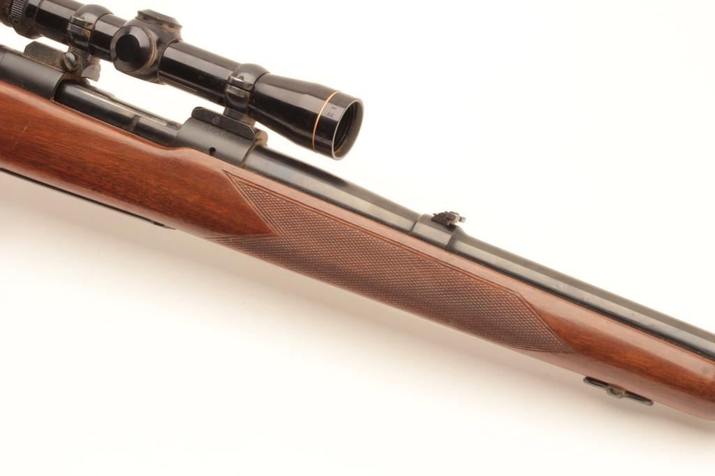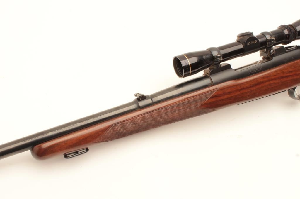 18BG-12 WINCHESTER PRE 64 #467650Winchester Model 70 bolt action pre-64 rifle, .338 Win. Mag. caliber, 25” barrel, blued finish, checkered wood stock, S/N 467650, mounted with a Leupold 2x7 Vari X II scope displaying very good optics; in overall verygood + condition with a very good + bore, crisp action, sharp markings and very good to near fine wood stock. (C&R/PPT). Est.: $800-$1,600.Winchester Model 70 bolt action pre-64 rifle, .338 Win. Mag. caliber, 25” barrel, blued finish, checkered wood stock, S/N 467650, mounted with a Leupold 2x7 Vari X II scope displaying very good optics; in overall verygood + condition with a very good + bore, crisp action, sharp markings and very good to near fine wood stock. (C&R/PPT). Est.: $800-$1,600.