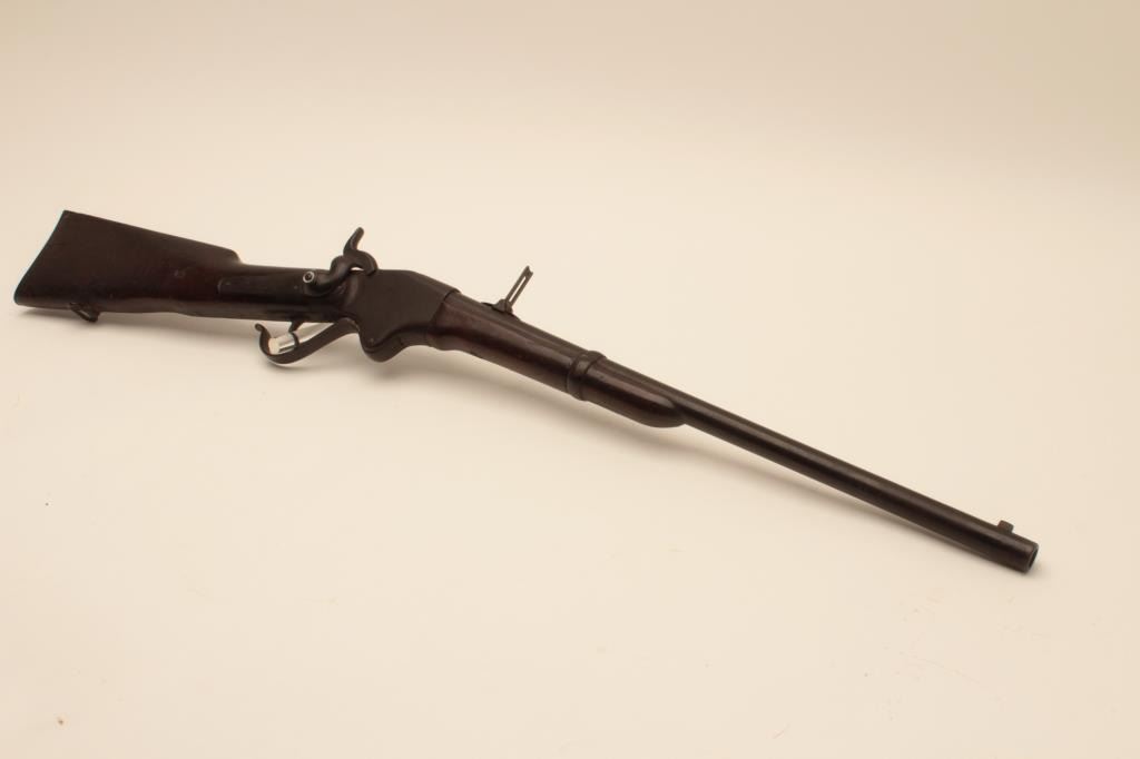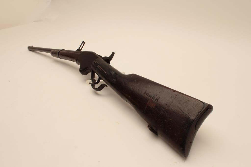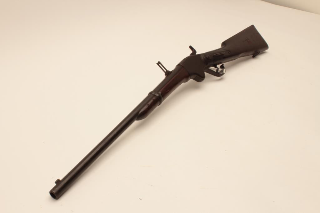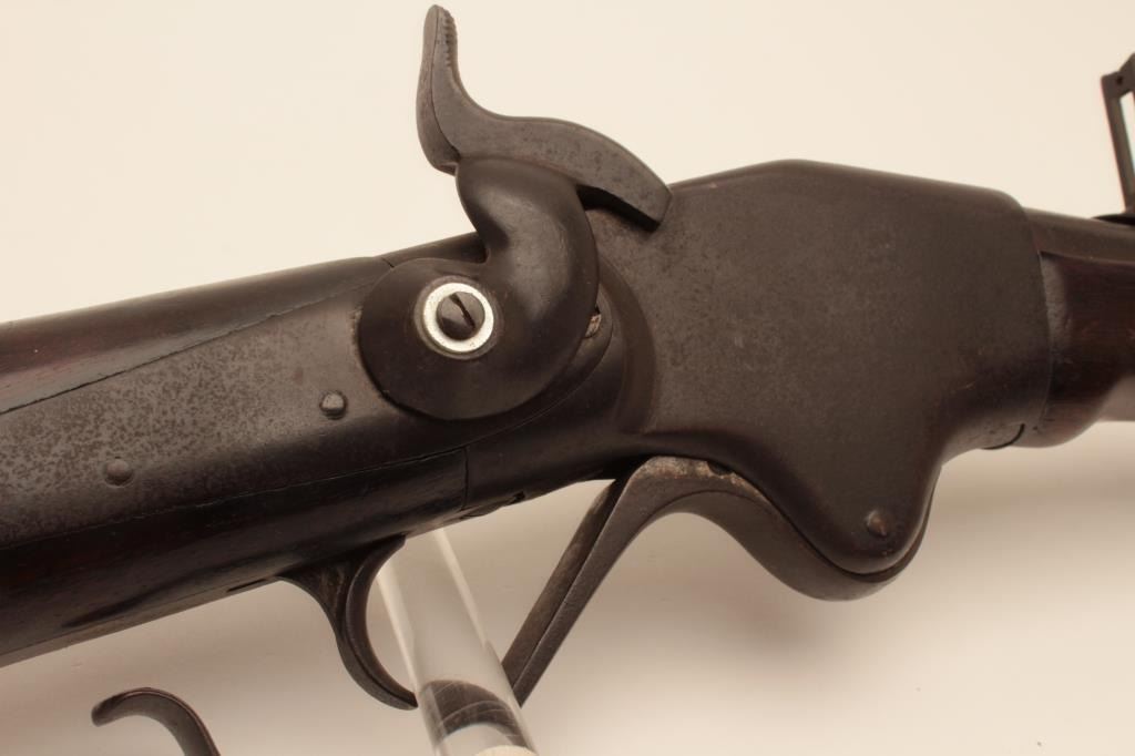 18AH-1 SPENCER CARBINE #36935Spencer Model 1860 Saddle Ring Carbine, .56 caliber, Serial #36935. The carbine is in good overall condition with a 22” barrel with a silver blade front and military tangent rear sight. The barrel and receiver havegone to a heavy dark brown patina with light surface erosion noted. The action retains the original saddle ring bar and has a replacement washer added to the hammer. The smooth wood stock has seen considerable wearwith mars, dents and compressions consistent with service use. The butt stock has a sling swivel, an old cartouche on both sides of the butt that appears to read, “YORKE” and ends with a smooth steel butt plate.According to the consignor, this Civil War era Spencer descended through the Cartwright Family of Sunflower County, Mississippi and was in the personal collection of Sheriff Cartwright. The bore is fair, the actionfunctions and the markings are legible on this Civil War era Spencer which may be researchable. Est.: $800-$1,600. (Antique).Spencer Model 1860 Saddle Ring Carbine, .56 caliber, Serial #36935. The carbine is in good overall condition with a 22” barrel with a silver blade front and military tangent rear sight. The barrel and receiver havegone to a heavy dark brown patina with light surface erosion noted. The action retains the original saddle ring bar and has a replacement washer added to the hammer. The smooth wood stock has seen considerable wearwith mars, dents and compressions consistent with service use. The butt stock has a sling swivel, an old cartouche on both sides of the butt that appears to read, “YORKE” and ends with a smooth steel butt plate.According to the consignor, this Civil War era Spencer descended through the Cartwright Family of Sunflower County, Mississippi and was in the personal collection of Sheriff Cartwright. The bore is fair, the actionfunctions and the markings are legible on this Civil War era Spencer which may be researchable. Est.: $800-$1,600. (Antique).