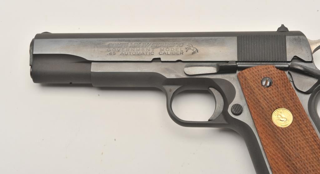 17AJ-7 COLT SERIES 70 #65272B70Colt MK IV Series 70 Government Model semi-automatic pistol, .45 caliber, 5” barrel, blued finish, checkered wood medallion grips, S/N 65272B70, in like new condition in factory wood grain cardboard box with inserts and instructions. (Modern/PPT). Est.: $800-$1,600.Colt MK IV Series 70 Government Model semi-automatic pistol, .45 caliber, 5” barrel, blued finish, checkered wood medallion grips, S/N 65272B70, in like new condition in factory wood grain cardboard box with inserts and instructions. (Modern/PPT). Est.: $800-$1,600.