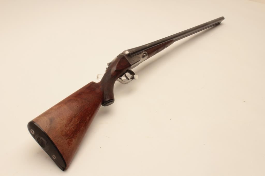 18AO-2 PARKER BROS SXS #108602Parker Bros. side by side shotgun, 12 gauge, Serial #108602. The shotgun is good to nearly very good overall condition with 30” barrels. The barrels feature a steel bead front sight with a full-length filed rib andParker Bros. barrel address noting the use of, “VULCAN STEEL”. The barrels retain the majority of their muted blue finish with scratches, mars and loss of finish at the muzzle. The receiver shows muted casehardening with more vivid colors hidden under the lever and in protected areas around the trigger guard. The receiver also has border engraving, a tang mounted safety and double triggers. The checkered wood stocks are ingood condition with a splinter fore end, small mars, loss of finish and a chip at the toe. The buttstock ends with a Parker Bros. hard rubber butt plate which is damaged at the toe providing a 14” LOP to the fronttrigger. The bores are good, the action crisp and markings are sharp. Est.: $800-$1,600. (C+R).Parker Bros. side by side shotgun, 12 gauge, Serial #108602. The shotgun is good to nearly very good overall condition with 30” barrels. The barrels feature a steel bead front sight with a full-length filed rib andParker Bros. barrel address noting the use of, “VULCAN STEEL”. The barrels retain the majority of their muted blue finish with scratches, mars and loss of finish at the muzzle. The receiver shows muted casehardening with more vivid colors hidden under the lever and in protected areas around the trigger guard. The receiver also has border engraving, a tang mounted safety and double triggers. The checkered wood stocks are ingood condition with a splinter fore end, small mars, loss of finish and a chip at the toe. The buttstock ends with a Parker Bros. hard rubber butt plate which is damaged at the toe providing a 14” LOP to the fronttrigger. The bores are good, the action crisp and markings are sharp. Est.: $800-$1,600. (C+R).