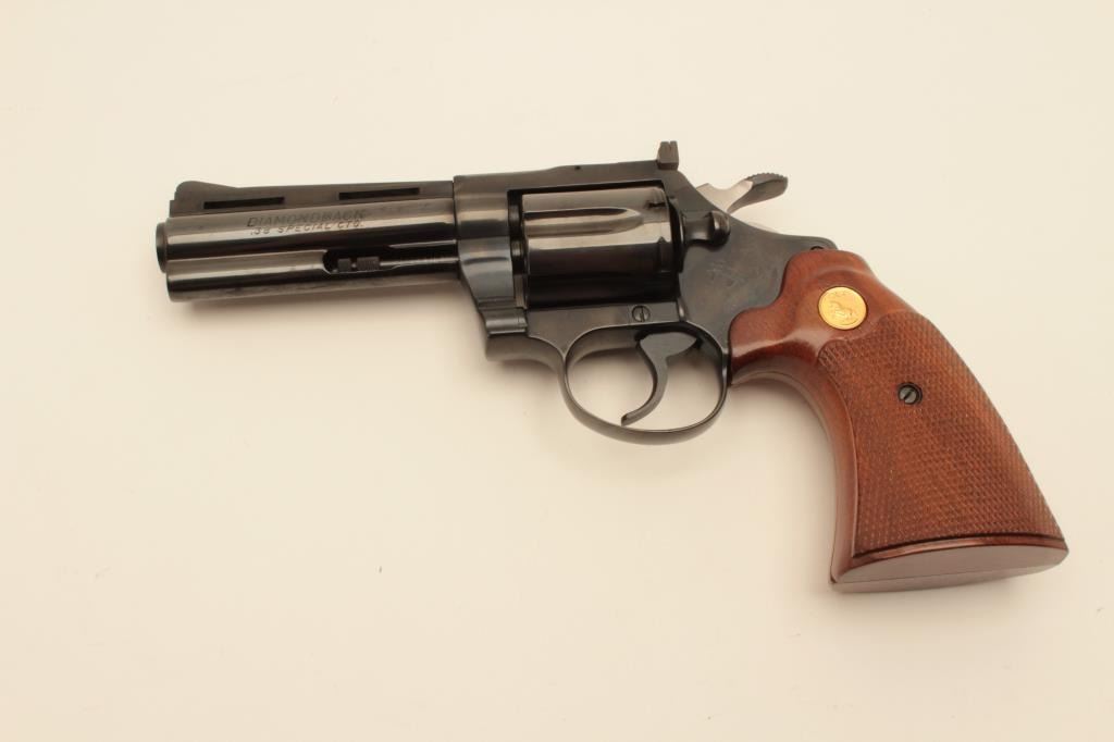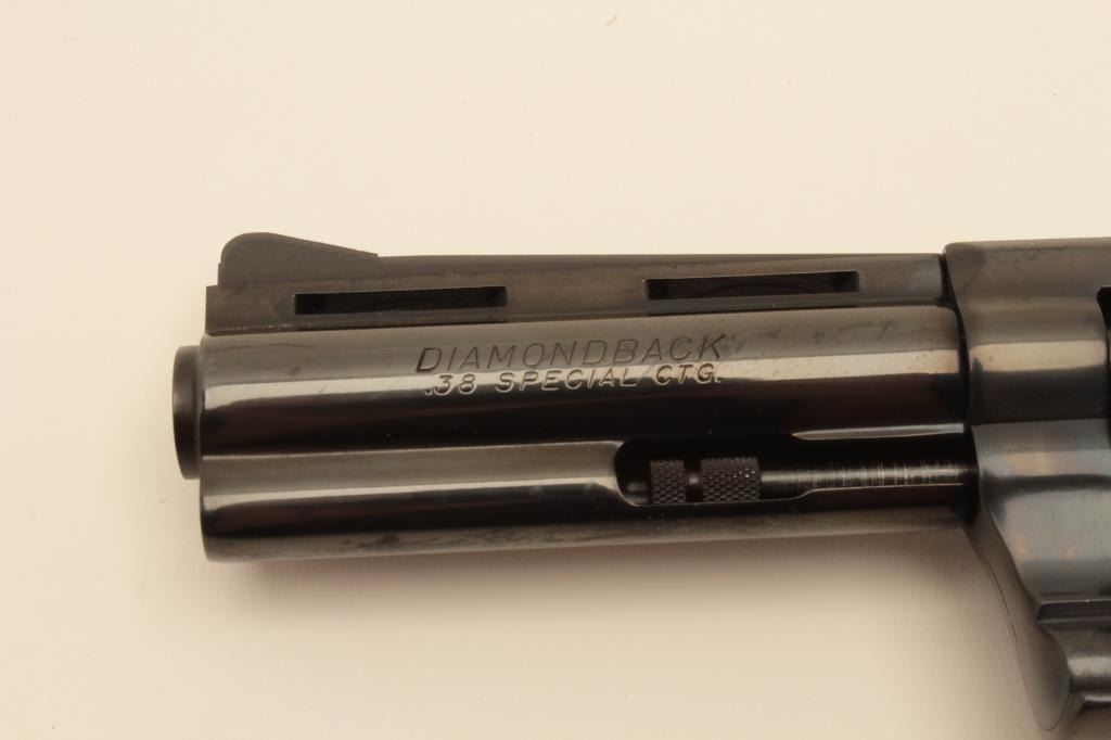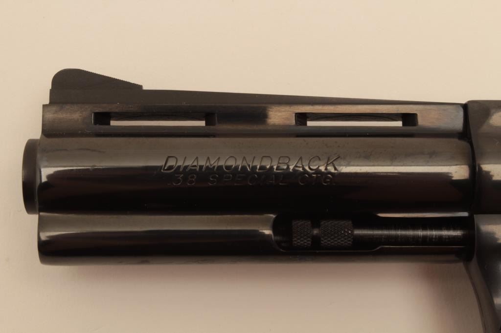 18AL-53 COLT DIAMONDBACK #N05826Colt Diamondback DA revolver, .38 Special caliber, 4” ventilated rib barrel, blued finish, checkered wood medallion grips, S/N N05826, in overall like new condition. (Modern/PPT). Est.: $1,000-$2,000.Colt Diamondback DA revolver, .38 Special caliber, 4” ventilated rib barrel, blued finish, checkered wood medallion grips, S/N N05826, in overall like new condition. (Modern/PPT). Est.: $1,000-$2,000.
