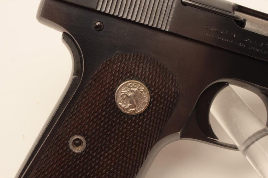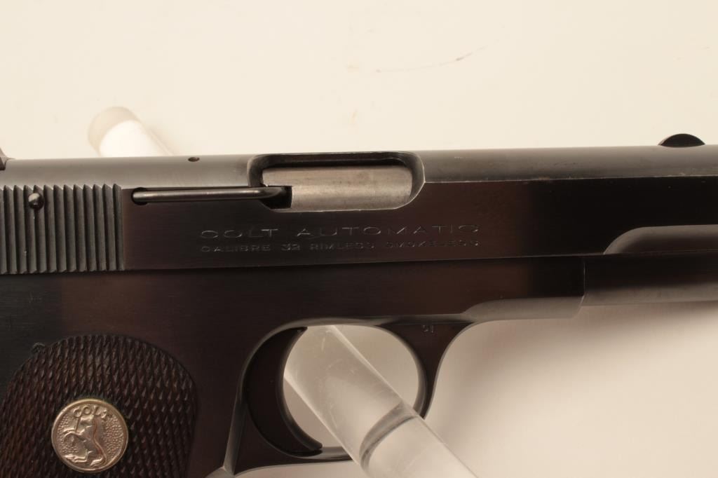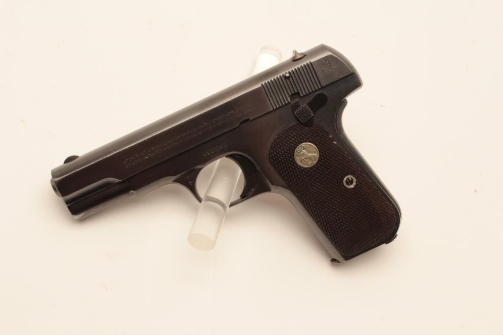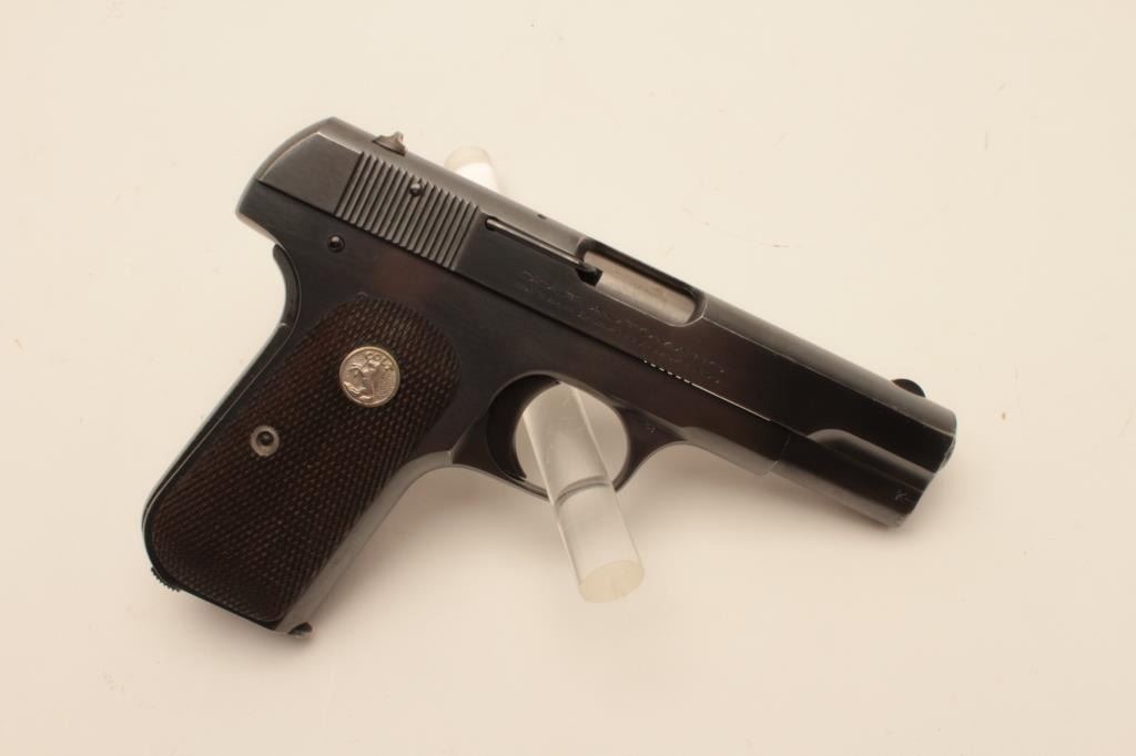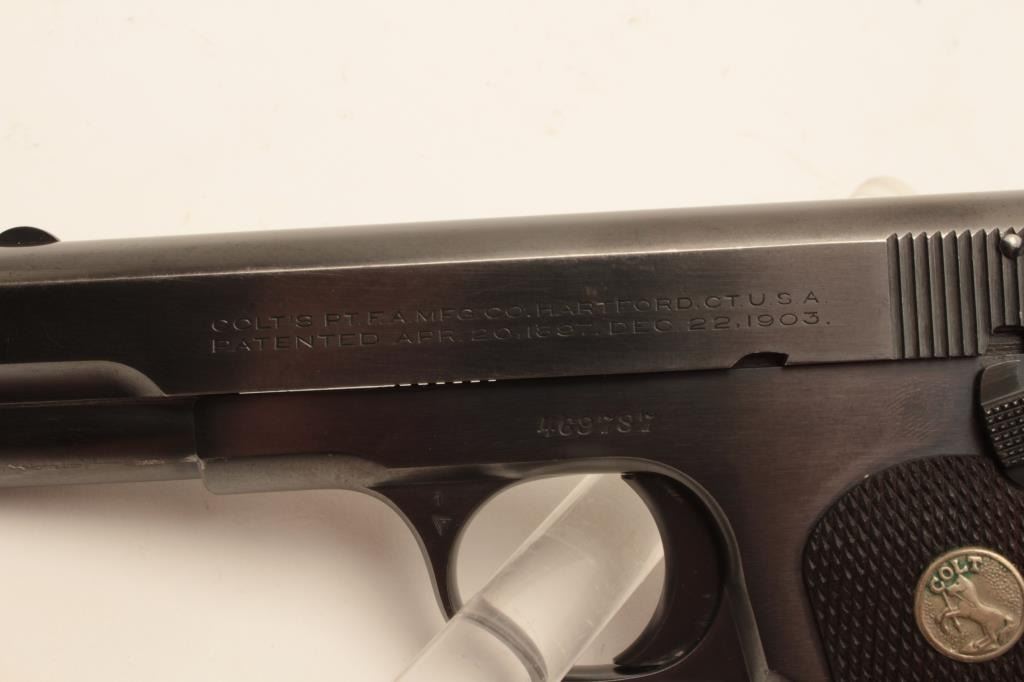 18BL-2 COLT 1903 #469787Colt Model 1903 semi-automatic pistol, .32 caliber, Serial #469787. The pistol is in nearly mint condition with a 3 ½” barrel. The pistol retains nearly all of its blue finish with high point edge wear and slightloss of finish at the muzzle. The Rampant Colt emblem is clearly displayed at the rear of the slide. The silver medallion checkered wood grips are in very good condition with light handling marks and sharp checkering.The bore is good, the action crisp and markings are sharp. The lot includes one correct magazine. Est.: $700-$1,400. (C+R).Colt Model 1903 semi-automatic pistol, .32 caliber, Serial #469787. The pistol is in nearly mint condition with a 3 ½” barrel. The pistol retains nearly all of its blue finish with high point edge wear and slightloss of finish at the muzzle. The Rampant Colt emblem is clearly displayed at the rear of the slide. The silver medallion checkered wood grips are in very good condition with light handling marks and sharp checkering.The bore is good, the action crisp and markings are sharp. The lot includes one correct magazine. Est.: $700-$1,400. (C+R).