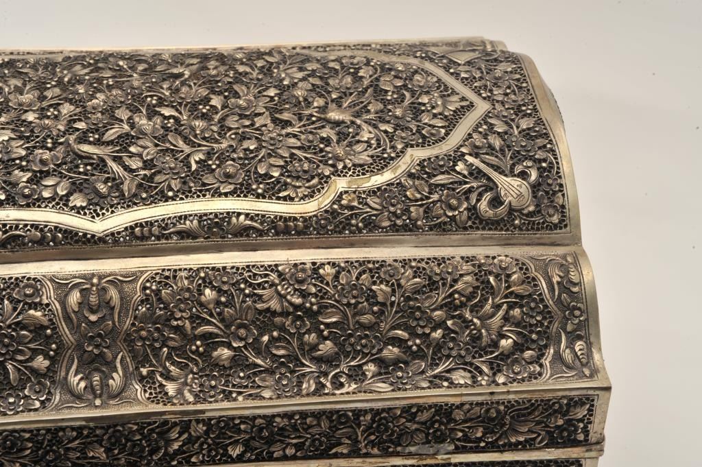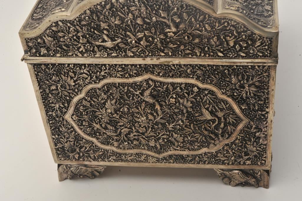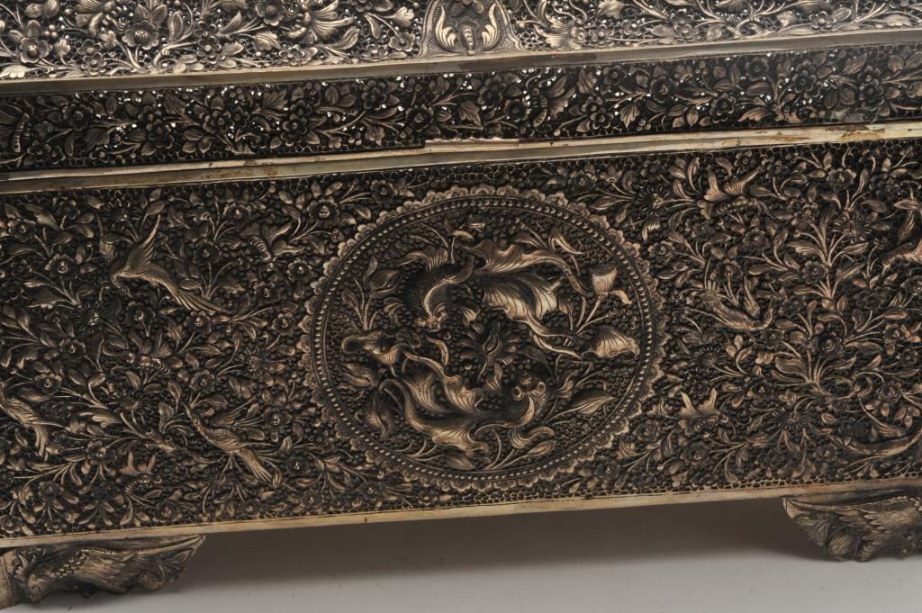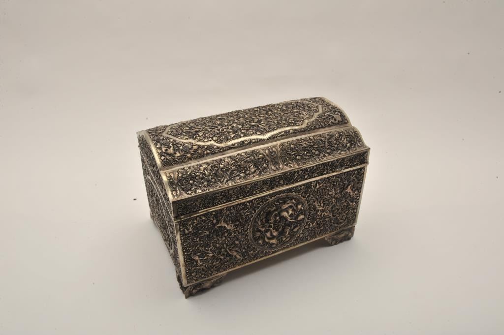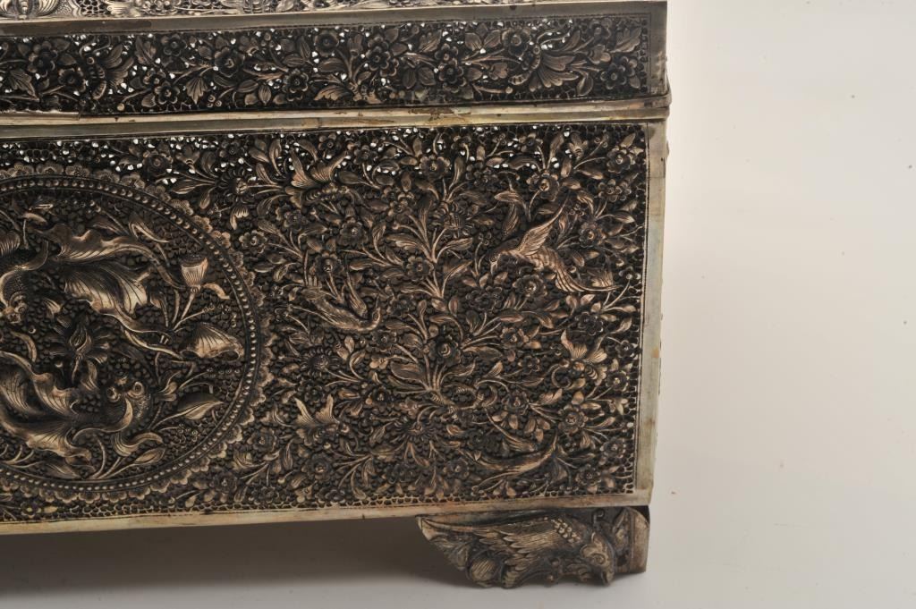 EVE-57 CAST CHINESEFancy pierced and cast Chinese chest probably silver gilt over copper circa 19th century. Measures 10” in height by 14” wide. Great detail of birds and florals. The estate of Eric Vaule. Est.: $600-$1200Fancy pierced and cast Chinese chest probably silver gilt over copper circa 19th century. Measures 10” in height by 14” wide. Great detail of birds and florals. The estate of Eric Vaule. Est.: $600-$1200