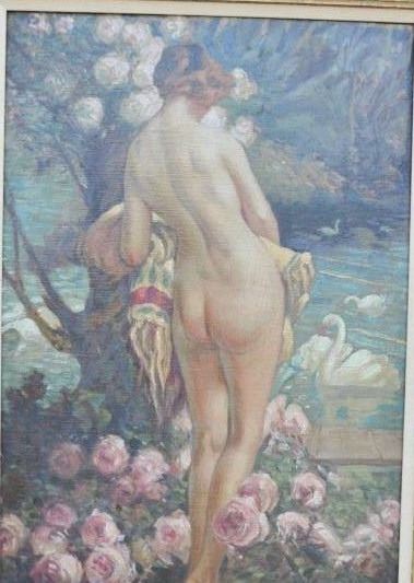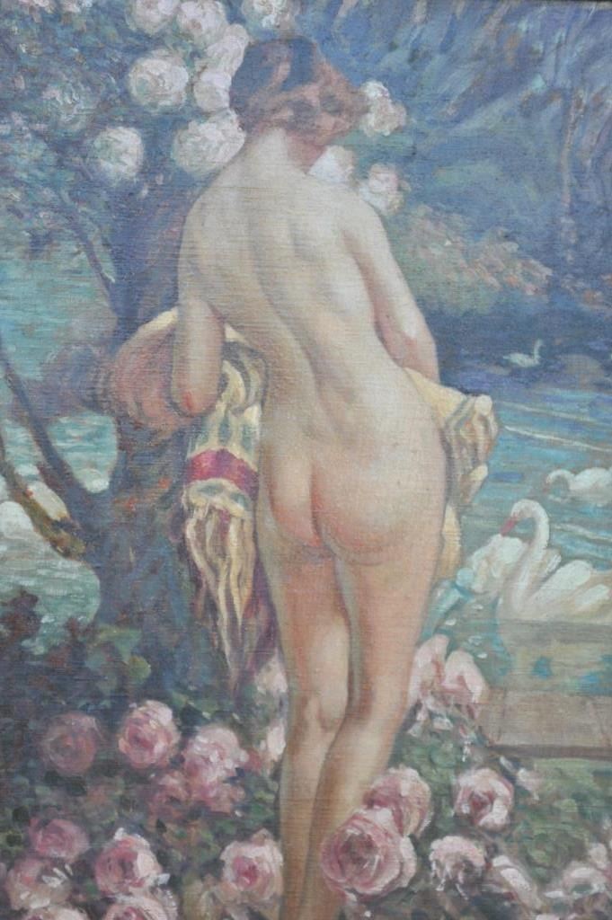 EVE-44 OIL PAINTINGImpressionist oil painting on board of nude with swans circa early 20th century and possibly French. Measures 19 ½” x 14 ½” with vintage frame. Good condition as found. Needs cleaning. The estate of Eric Vaule. Apainting dealer since the 1960’s Eric kept this work due to lack of signature. Its value to him was more than the market value. Est.: $900-$1800Impressionist oil painting on board of nude with swans circa early 20th century and possibly French. Measures 19 ½” x 14 ½” with vintage frame. Good condition as found. Needs cleaning. The estate of Eric Vaule. Apainting dealer since the 1960’s Eric kept this work due to lack of signature. Its value to him was more than the market value. Est.: $900-$1800