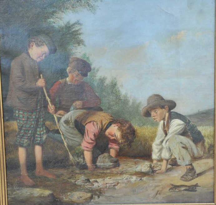 Lot 73 EVE-31 OIL ON CANVASOriginal oil on canvas of Scottish boys fishing. 19th century. Measures approxi