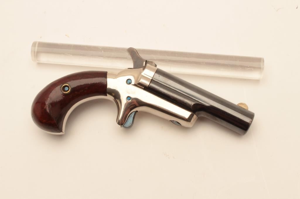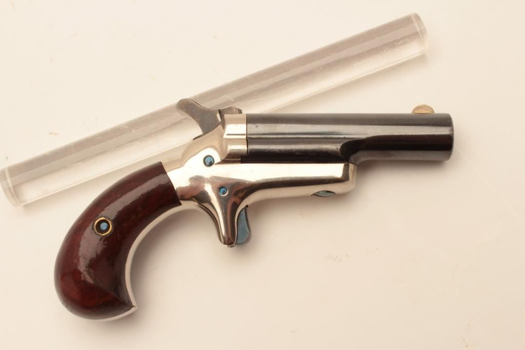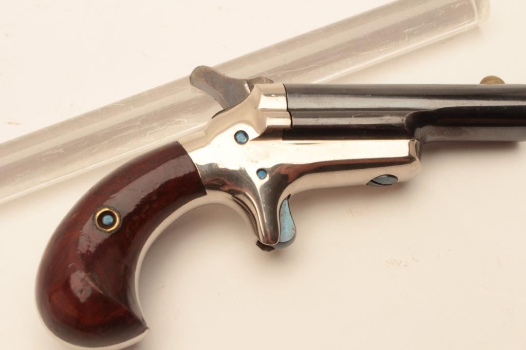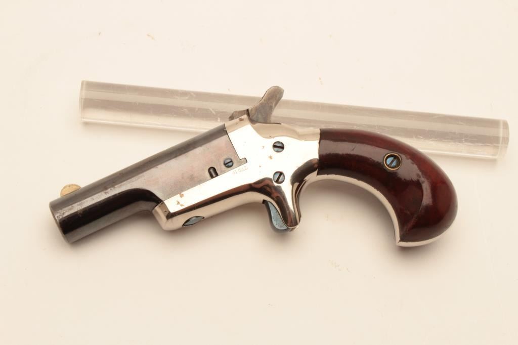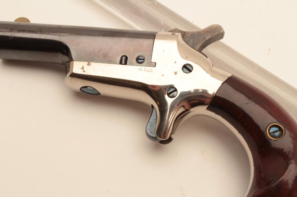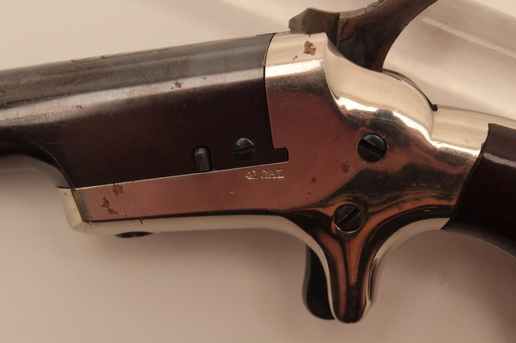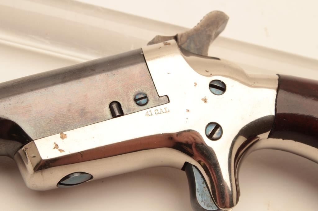 18BL-3 COLT THIRD MDL #NSNVColt Third Model Derringer, .41 caliber, serial #NSNV. The pistol is in fine overall condition with a 2” blue barrel and nickel frame. The barrel retains the majority of its blue finish some loss of finish at themuzzle and a silver blade front sight. The frame retains a significant amount of its polished nickel finish with beautiful nitre blue on the screw heads and vivid case hardening on the hammer. The smooth woodgrips are in very good condition retaining nearly all of their finish with only light storage marks. The bore is good, the action crisp and markings are sharp. Est.: $900-$1,800. (Antique).Colt Third Model Derringer, .41 caliber, serial #NSNV. The pistol is in fine overall condition with a 2” blue barrel and nickel frame. The barrel retains the majority of its blue finish some loss of finish at themuzzle and a silver blade front sight. The frame retains a significant amount of its polished nickel finish with beautiful nitre blue on the screw heads and vivid case hardening on the hammer. The smooth woodgrips are in very good condition retaining nearly all of their finish with only light storage marks. The bore is good, the action crisp and markings are sharp. Est.: $900-$1,800. (Antique).