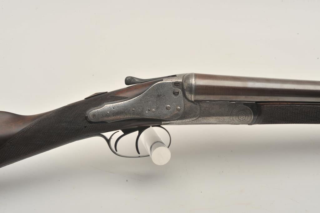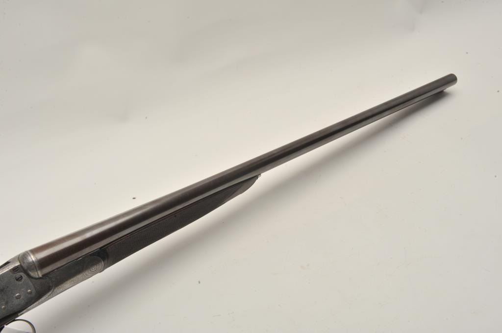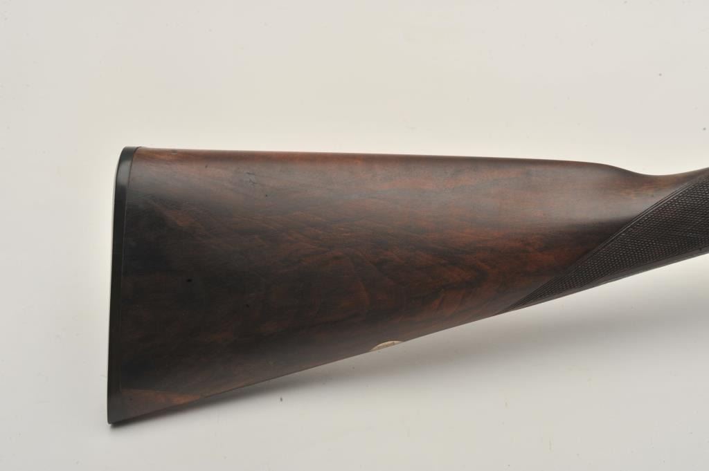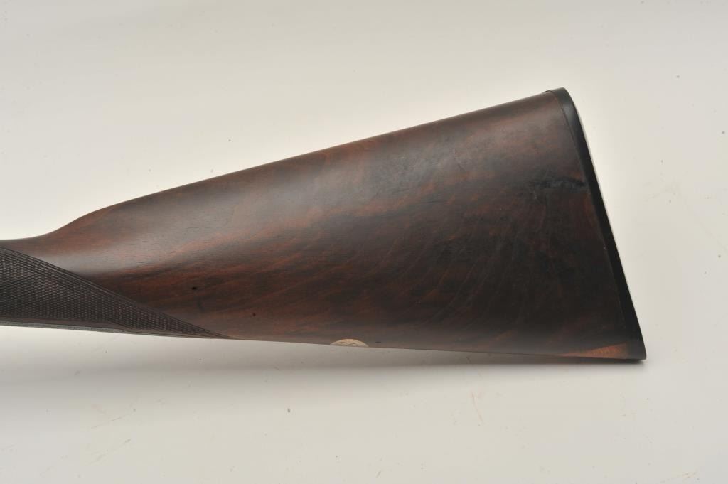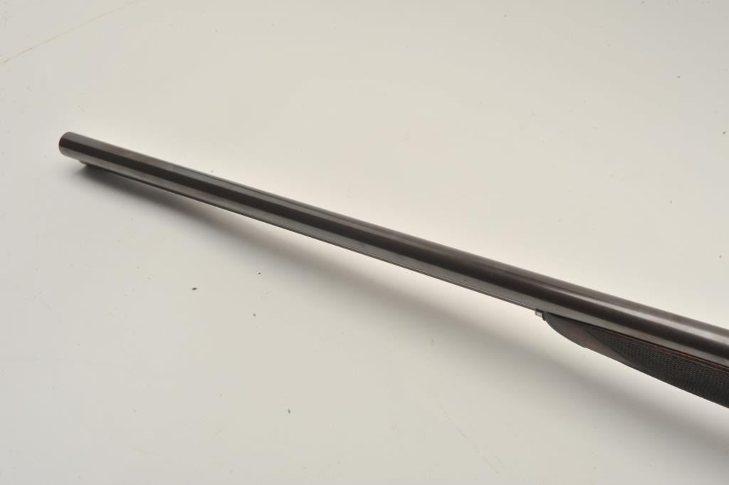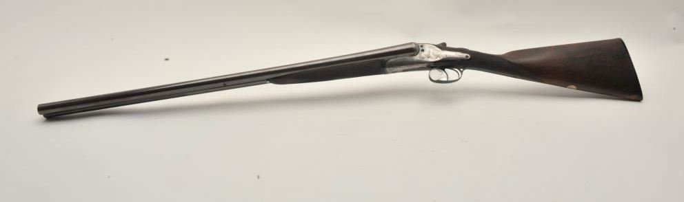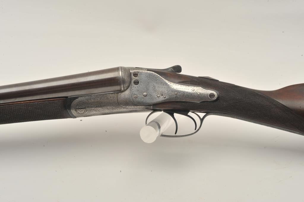 18AR-1 HOLLAND & HOLLANDHolland & Holland SxS sidelock shotgun with Damascus barrels marked Climax safety hammerless, S/N 6332 in 12GA with 28” barrel and measures 14 1/8” to the end of the wood and almost 14 ½” to the end of horn buttplate. Tight bank note scroll engraved. Shows 95%-98% tobacco brown restored finish on the barrels. Polished bright locks. Refinished wood with toe repaired. The trigger guard is nicely re-blued. A quality Europeanrestoration. Locks tight with good bores. Holland & Holland needs no advertising as they are world famous as makers of best quality London guns. (Antique) Est.: $1750-$3500Holland & Holland SxS sidelock shotgun with Damascus barrels marked Climax safety hammerless, S/N 6332 in 12GA with 28” barrel and measures 14 1/8” to the end of the wood and almost 14 ½” to the end of horn buttplate. Tight bank note scroll engraved. Shows 95%-98% tobacco brown restored finish on the barrels. Polished bright locks. Refinished wood with toe repaired. The trigger guard is nicely re-blued. A quality Europeanrestoration. Locks tight with good bores. Holland & Holland needs no advertising as they are world famous as makers of best quality London guns. (Antique) Est.: $1750-$3500