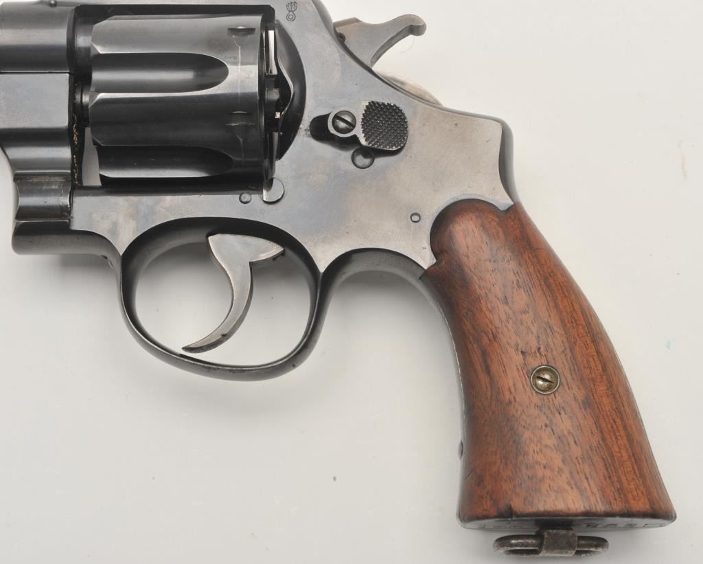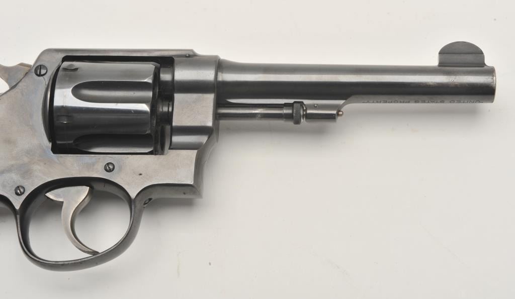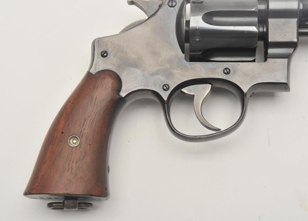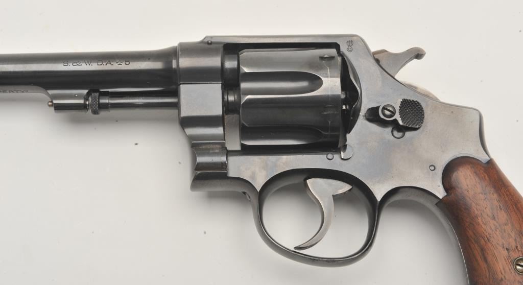 18AA-3 S&W 1917 #55339Smith and Wesson US Army Model 1917 revolver, .45 caliber, Serial #55339. The pistol is in fine overall condition with a 5 ½” barrel. The pistol retains nearly all of its blued finish with only light wear at the muzzle and a faint drag line on the cylinder. The trigger and hammer shows beautiful muted case hardening. The smooth wood grips are in good condition with small mars and light handling marks. The lanyard ring isretained in the butt. The bore is good, the action crisp and markings are sharp on this desirable Smith and Wesson. Est.: $1,000-$2,000. (C+R).Smith and Wesson US Army Model 1917 revolver, .45 caliber, Serial #55339. The pistol is in fine overall condition with a 5 ½” barrel. The pistol retains nearly all of its blued finish with only light wear at the muzzle and a faint drag line on the cylinder. The trigger and hammer shows beautiful muted case hardening. The smooth wood grips are in good condition with small mars and light handling marks. The lanyard ring isretained in the butt. The bore is good, the action crisp and markings are sharp on this desirable Smith and Wesson. Est.: $1,000-$2,000. (C+R).