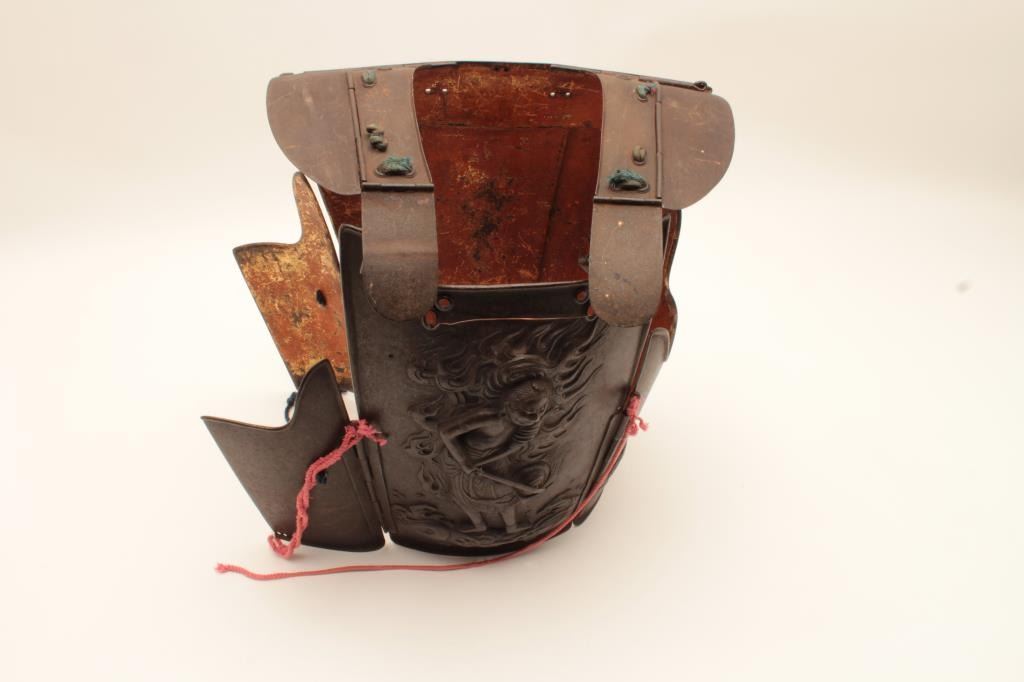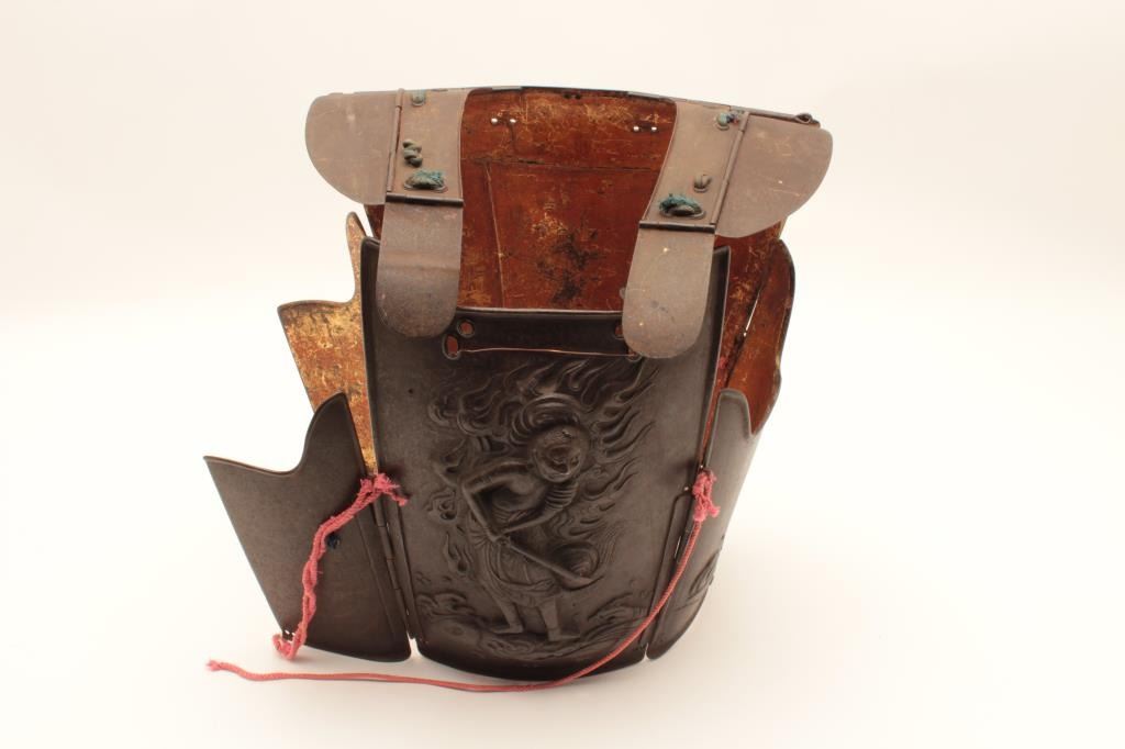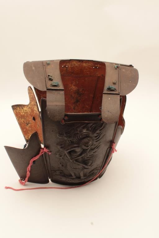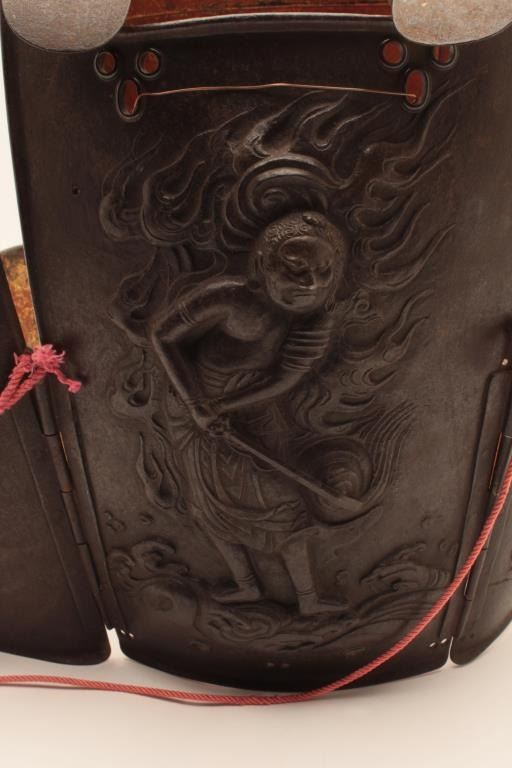 EVE-56 JAPANESE BREAST PLATERare 4 piece forged steel Japanese armor consisting of breast plate, matching back plate and side panels. Signed inside. Circa 17th to 18th century. Figure of god with sword in flames carried through thedecorations. Good to very good condition. The estate of Eric Vaule. Est.: $7,500-$15,000Rare 4 piece forged steel Japanese armor consisting of breast plate, matching back plate and side panels. Signed inside. Circa 17th to 18th century. Figure of god with sword in flames carried through thedecorations. Good to very good condition. The estate of Eric Vaule. Est.: $7,500-$15,000