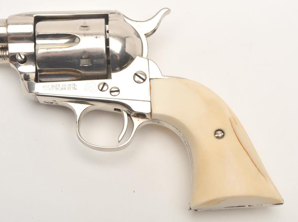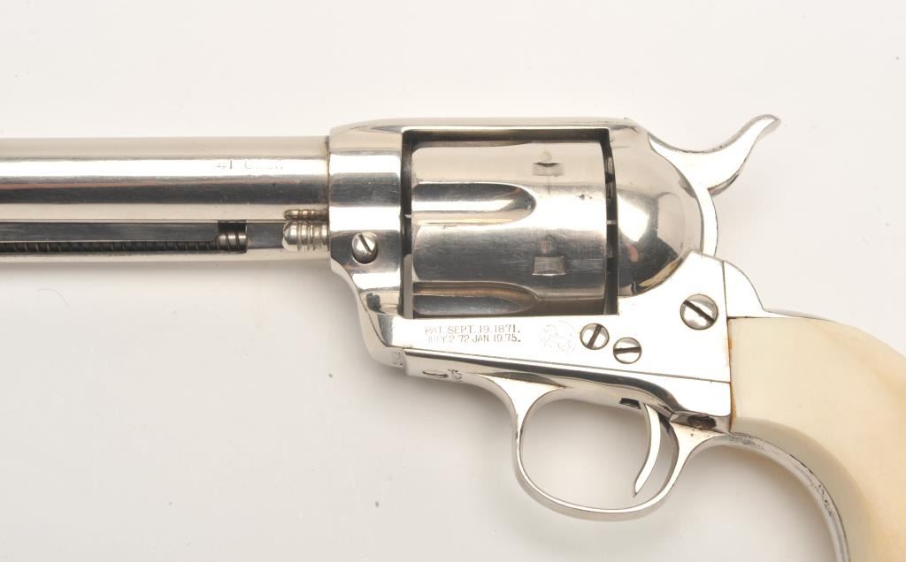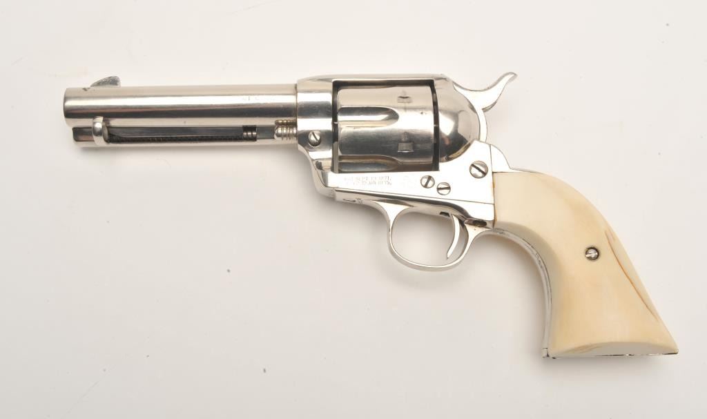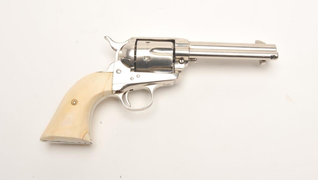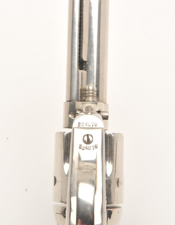 17FS-4 COLT SA 4.75" .41LC W/LETTER #254679Colt SAA revolver, .41 Colt caliber, 4.75” barrel, old re-finished nickel, stag or bone grips, S/N 254679, in overall good condition showing the majority of the old re-nickel finish, good bore, crisp action, goodmarkings overall, good non-factory grips with a couple old repairs to the right grip. Accompanied by a Colt factory letter confirming caliber and barrel length with “Blue” finish listed and type of stocks “NotListed”; shipped to Simmons Hardware Co., St. Louis, Missouri on May 31, 1905, fifteen guns in shipment. (C&R/No PPT). Est.: $1,250-$2,500.Colt SAA revolver, .41 Colt caliber, 4.75” barrel, old re-finished nickel, stag or bone grips, S/N 254679, in overall good condition showing the majority of the old re-nickel finish, good bore, crisp action, goodmarkings overall, good non-factory grips with a couple old repairs to the right grip. Accompanied by a Colt factory letter confirming caliber and barrel length with “Blue” finish listed and type of stocks “NotListed”; shipped to Simmons Hardware Co., St. Louis, Missouri on May 31, 1905, fifteen guns in shipment. (C&R/No PPT). Est.: $1,250-$2,500.