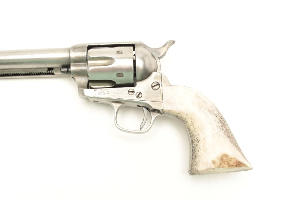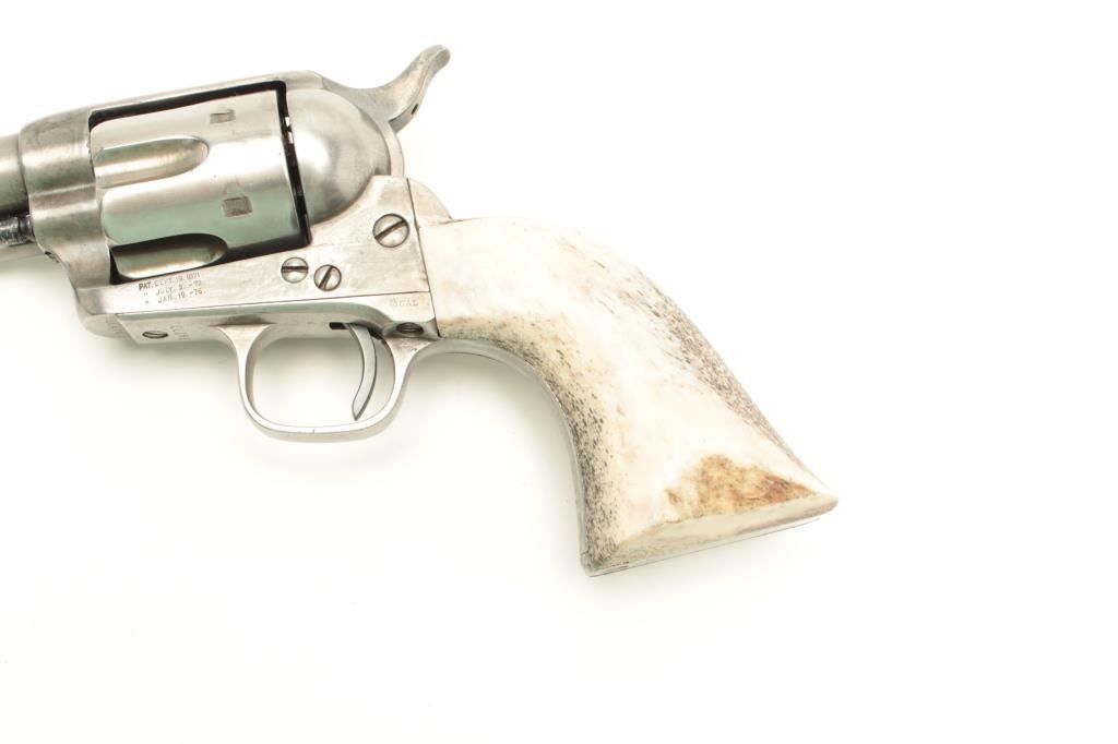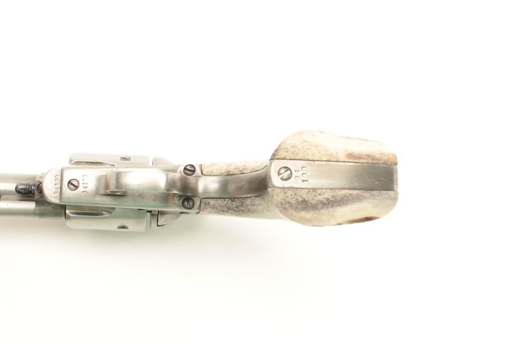 17FS-41 COLT S.A. #34100Colt SAA revolver, .45 caliber, 7.5” barrel, stag grips, S/N 34,100 (matching visible numbers except cylinder which is #4947), in overall good condition showing an old light cleaning to metal surfaces, crispaction,sharp markings, good bore and thick stag grips; accompanied by a Colt factory letter stating .45 caliber, blued finish, barrel length indication of 7.5” and stocks “Not Listed”; shipped to H&D Folsom ArmsCo., New York City on May 22, 1878, fifty guns in shipment. (Antique). Est.: $1,750-$3,500.Colt SAA revolver, .45 caliber, 7.5” barrel, stag grips, S/N 34,100 (matching visible numbers except cylinder which is #4947), in overall good condition showing an old light cleaning to metal surfaces, crispaction,sharp markings, good bore and thick stag grips; accompanied by a Colt factory letter stating .45 caliber, blued finish, barrel length indication of 7.5” and stocks “Not Listed”; shipped to H&D Folsom ArmsCo., New York City on May 22, 1878, fifty guns in shipment. (Antique). Est.: $1,750-$3,500.