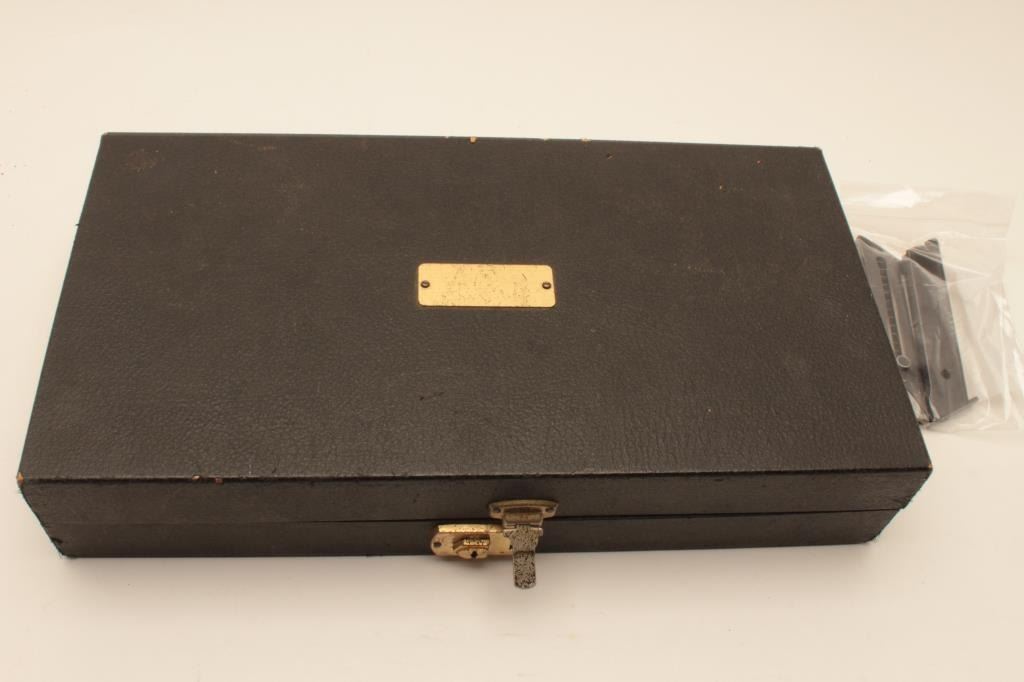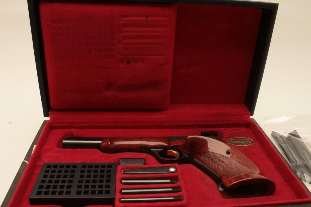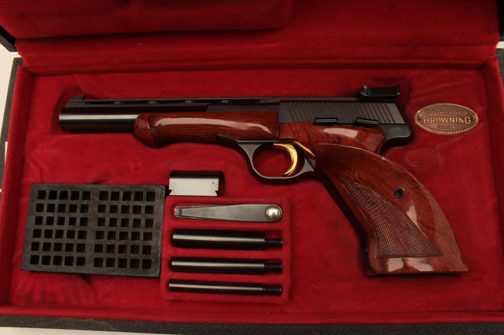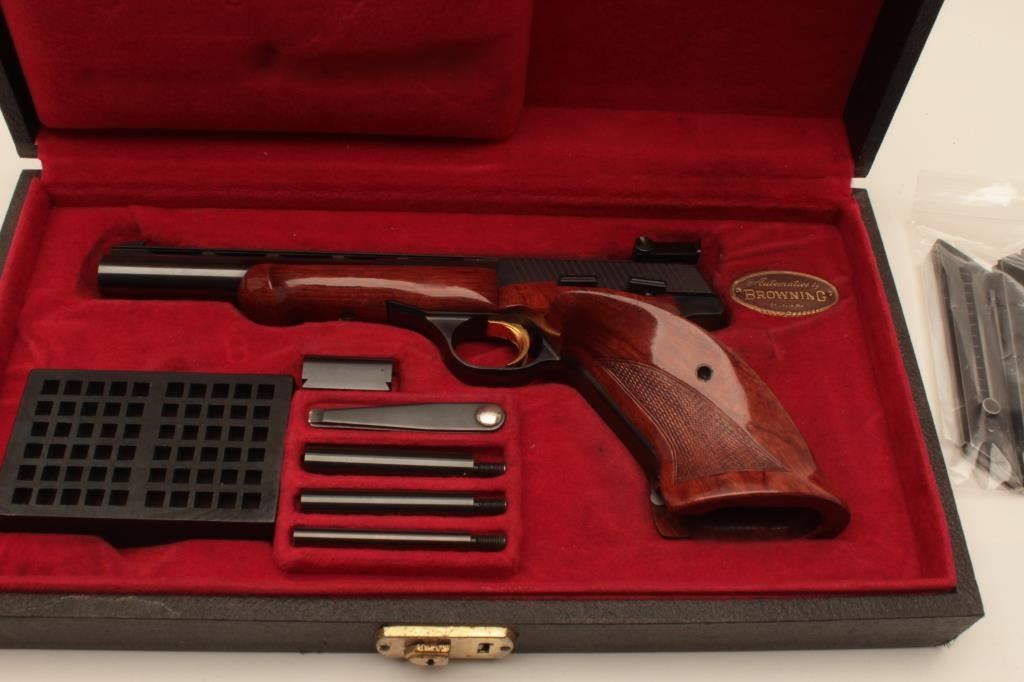 18AB-2 BROWNING MEDALIST #38424T5Browning Medalist semi-automatic pistol, .22 Long Rifle, Serial #38424T5. The pistol is in fine overall condition with a 6 ¾” barrel with a full-length ventilated ramp and adjustable rear target sights. The barreland action retain nearly all of their original blue finish with a Belgian proof on the underside of the barrel. The finely checkered, oversized wood target grips are in very good condition showing only handlingand storage marks. The pistol is cased in a red velvet lined box with three correct magazines, loading block, wrench and weights. The bore is very good, the action is crisp and markings are sharp on this beautifulcased Belgian Browning Medalist. Est.: $600-$1,200. (Modern).Browning Medalist semi-automatic pistol, .22 Long Rifle, Serial #38424T5. The pistol is in fine overall condition with a 6 ¾” barrel with a full-length ventilated ramp and adjustable rear target sights. The barreland action retain nearly all of their original blue finish with a Belgian proof on the underside of the barrel. The finely checkered, oversized wood target grips are in very good condition showing only handlingand storage marks. The pistol is cased in a red velvet lined box with three correct magazines, loading block, wrench and weights. The bore is very good, the action is crisp and markings are sharp on this beautifulcased Belgian Browning Medalist. Est.: $600-$1,200. (Modern).