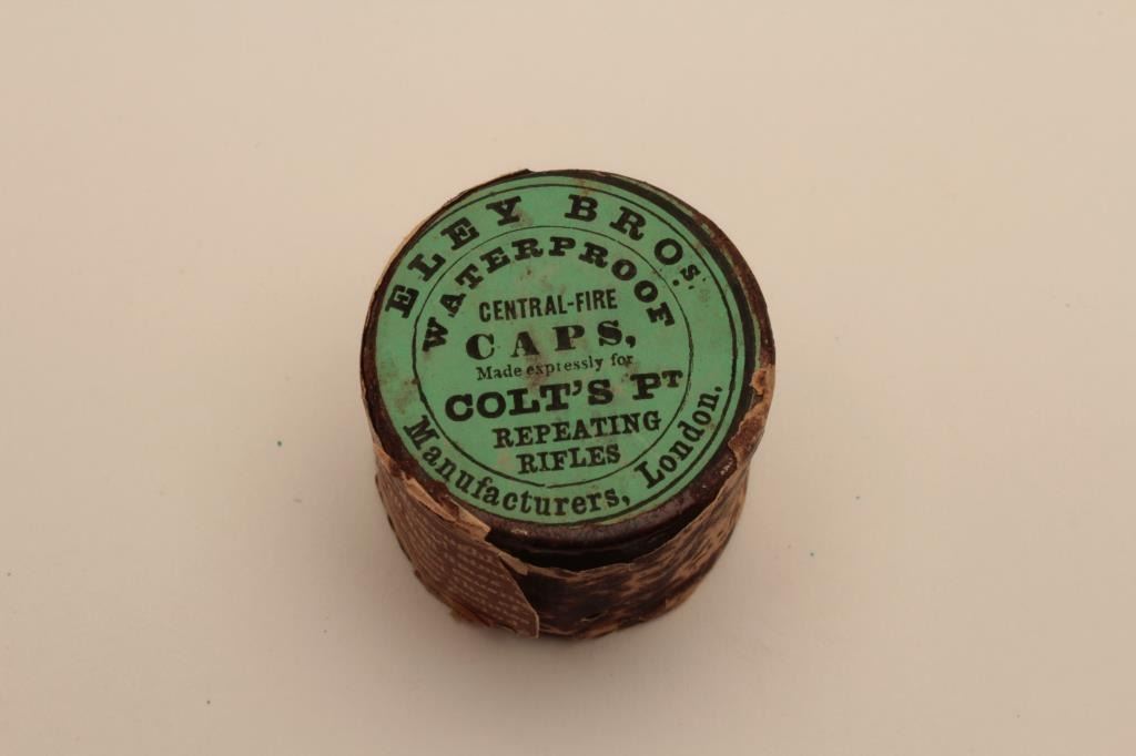 Lot 272 18AN-14 CAP TIN BY ELEYUnopened cap tin by Eley for Colt’s Patent Repeating Rifle (1855 Root). Labe