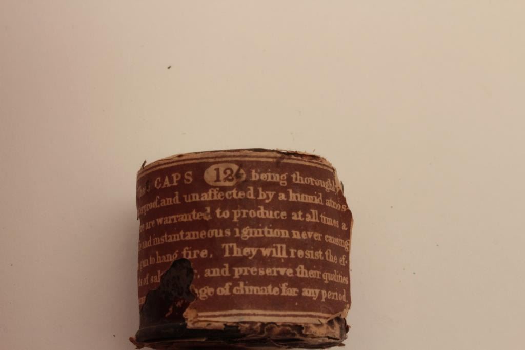 18AN-14 CAP TIN BY ELEYUnopened cap tin by Eley for Colt’s Patent Repeating Rifle (1855 Root). Label fine. Paper wrap is 75%. Est.: $200-$400Unopened cap tin by Eley for Colt’s Patent Repeating Rifle (1855 Root). Label fine. Paper wrap is 75%. Est.: $200-$400