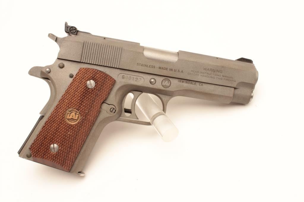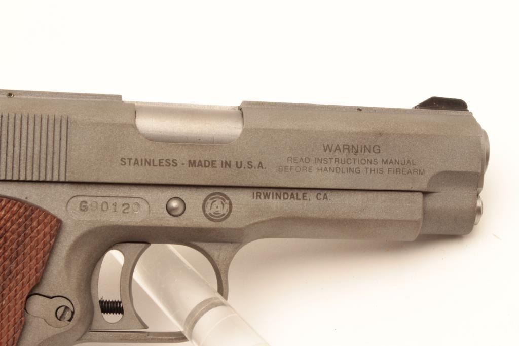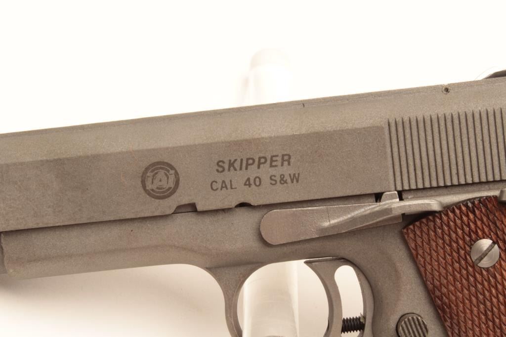 18BM-57 AMT SKIPPERIAI (Irwindale Arms Inc) Skipper .40 S&W cal., compact stainless semi auto pistol, #G00120, 4 1/4" barrel, 3 dot adjustable sights, checkered medallion grips. Pistol is in as new condition, excellent bore andaction. Includes one mag and original box in very good condition. Note: Consecutive serial number to next lot. (Modern / PPT) Est. $400-800IAI (Irwindale Arms Inc) Skipper .40 S&W cal., compact stainless semi auto pistol, #G00120, 4 1/4" barrel, 3 dot adjustable sights, checkered medallion grips. Pistol is in as new condition, excellent bore andaction. Includes one mag and original box in very good condition. Note: Consecutive serial number to next lot. (Modern / PPT) Est. $400-800