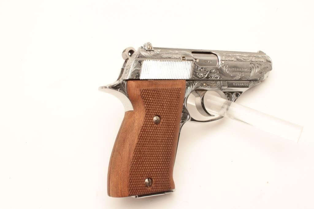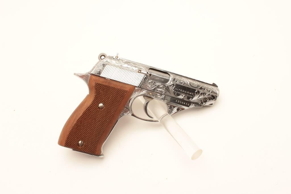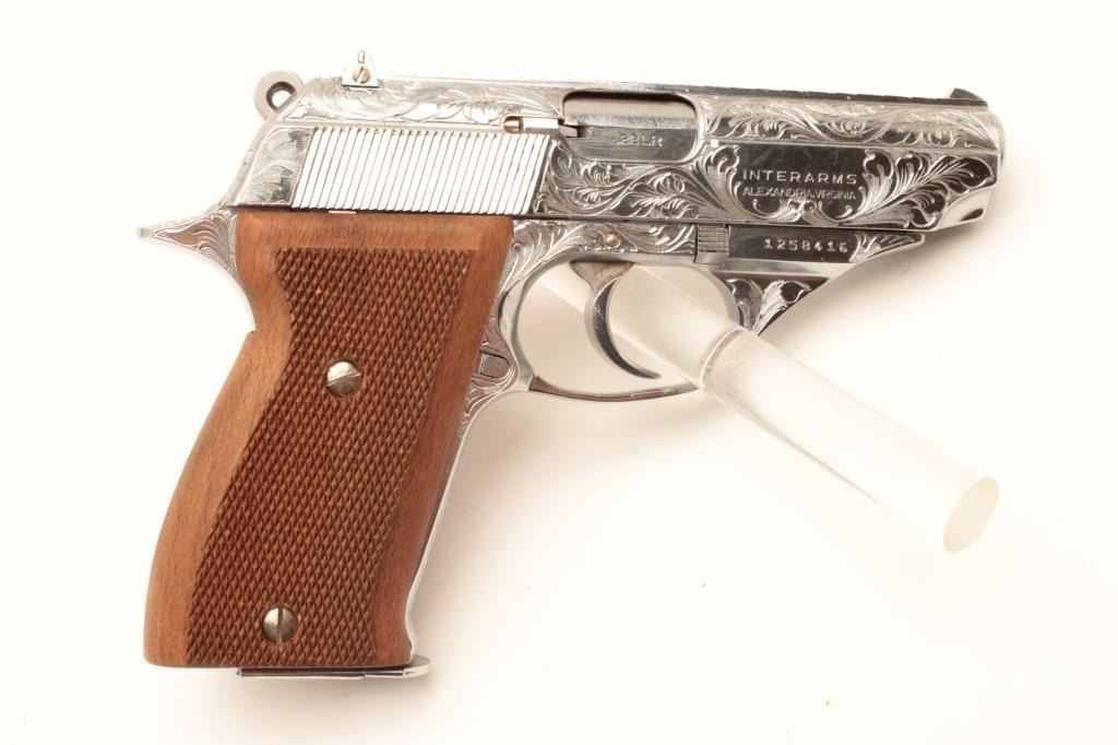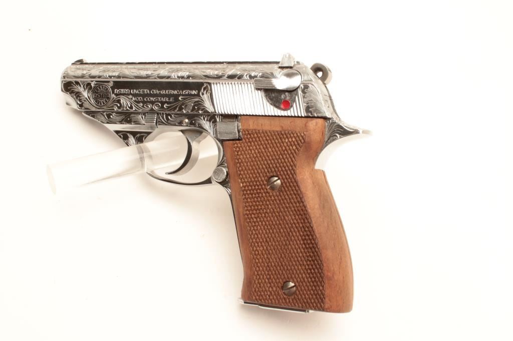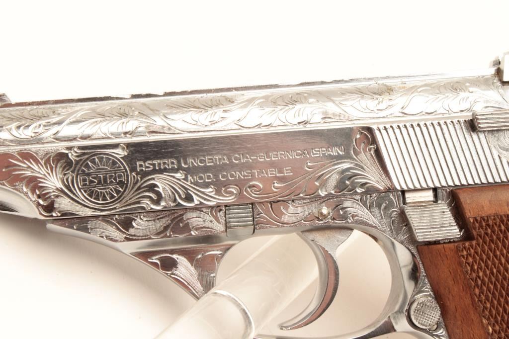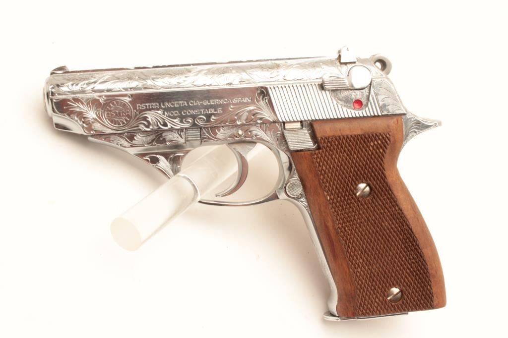 18BM-65 ASTRA CONST.Astra Constable engraved .22 LR chromed semi automatic pistol, #1258416, 3 1/2" barrel, adjustable sights, checkered hardwood grips. Pistol is in as new condition, in the original box, with manual and one mag.(Modern / PPT) Est $250-500Astra Constable engraved .22 LR chromed semi automatic pistol, #1258416, 3 1/2" barrel, adjustable sights, checkered hardwood grips. Pistol is in as new condition, in the original box, with manual and one mag.(Modern / PPT) Est $250-500