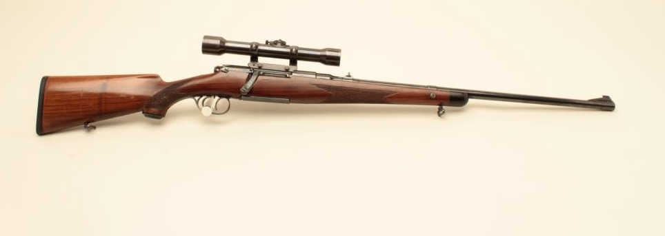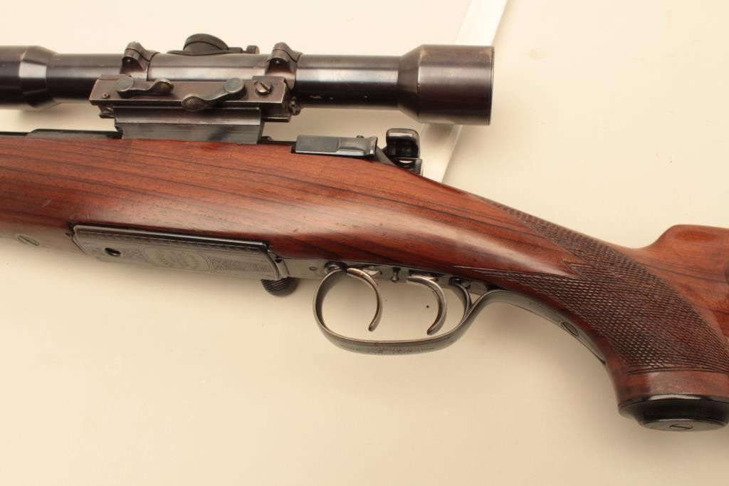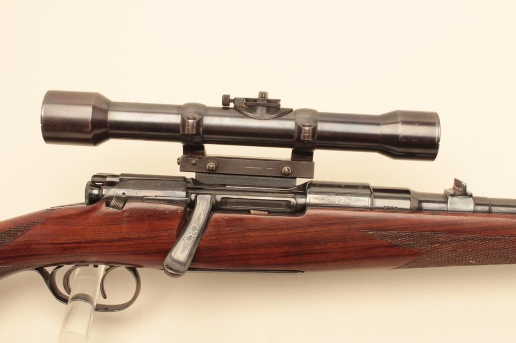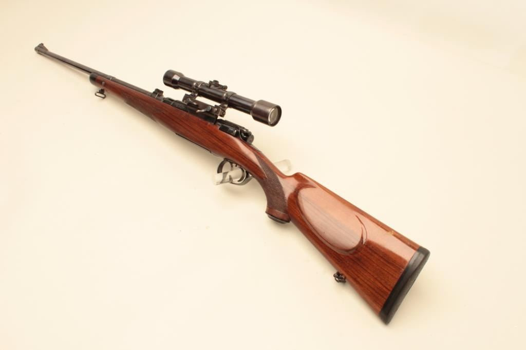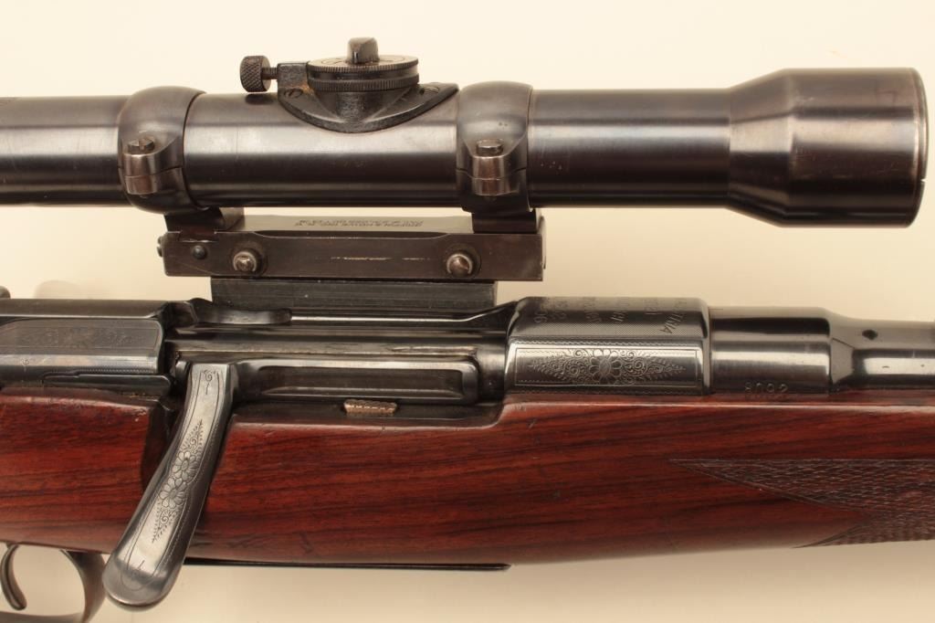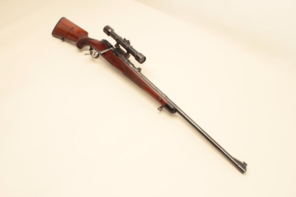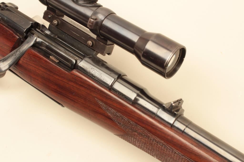 17FL-67 MANNLICHER #8092Mannlicher Model 1952 bolt action rifle, .30-06 caliber, 24” barrel, refinished blue, double set triggers working at time of description, checkered wood stock, S/N 8092, mounted with a Zeiss scope and Griffin & Howe mount; scope has good optics; gun is overall very good + as re-finished with a very good bore, crisp action, very good markings and very good wood stock that has also been re-finished. (C&R). Est.:$1,400-$2,800.Mannlicher Model 1952 bolt action rifle, .30-06 caliber, 24” barrel, refinished blue, double set triggers working at time of description, checkered wood stock, S/N 8092, mounted with a Zeiss scope and Griffin & Howe mount; scope has good optics; gun is overall very good + as re-finished with a very good bore, crisp action, very good markings and very good wood stock that has also been re-finished. (C&R). Est.:$1,400-$2,800.
