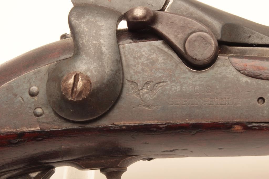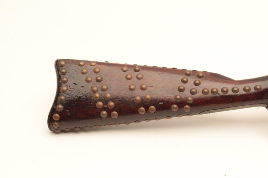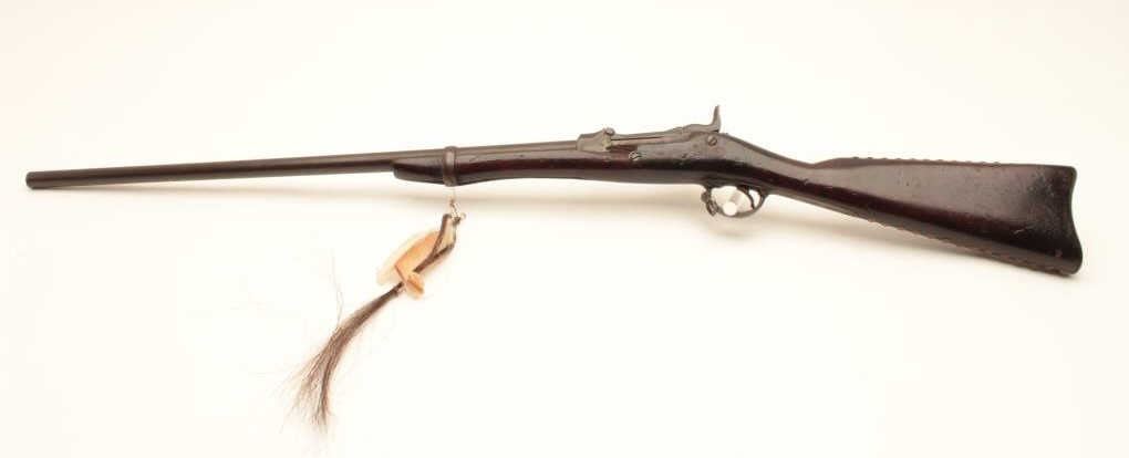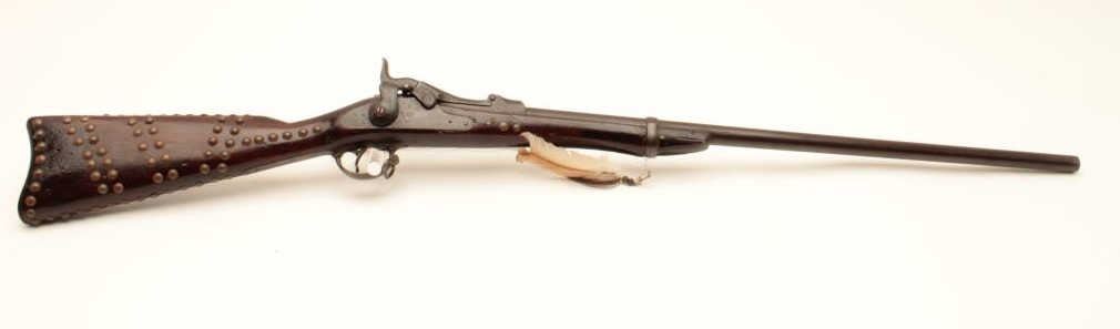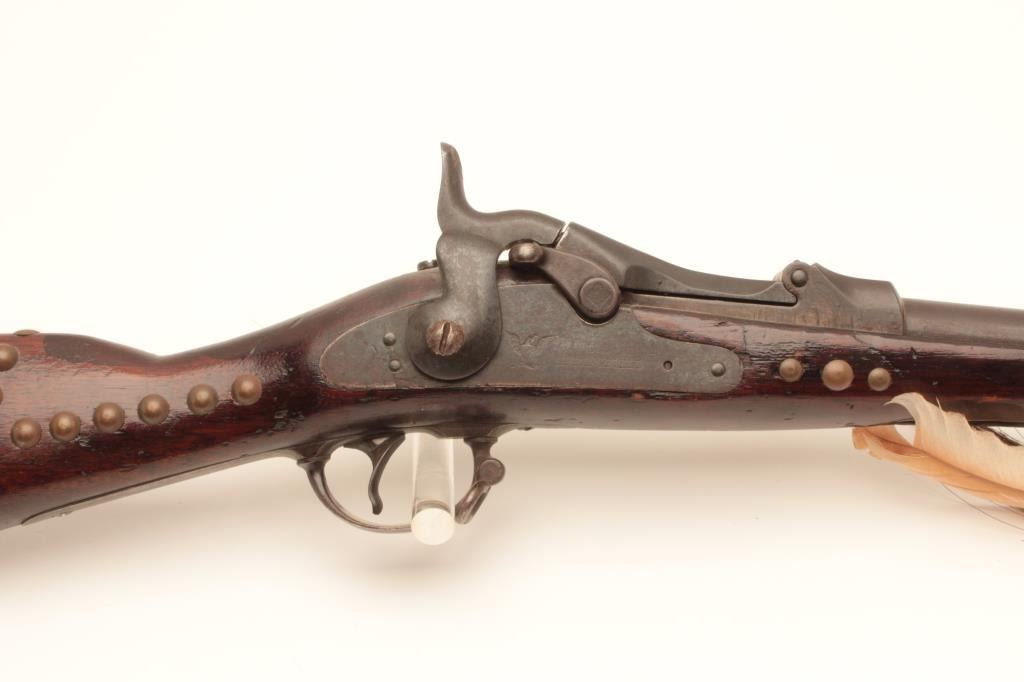 18AP-26 SPRINGFIELD TACKEDCut down Springfield Model 1884 Trapdoor single shot rifle, .45 caliber, Serial #NSNV. The rifle is in fair overall condition with a26” barrel with both front and rear sights removed. The metal surfaces have gone to adark brown patina. The side plate still reads US Springfield with the eagle. The smooth wood stock has been decorated with brass tacks and feather and horsehair ornamentation attached to the barrel band. A nice decorator piece. Est.: $300-$600. (Antique).Cut down Springfield Model 1884 Trapdoor single shot rifle, .45 caliber, Serial #NSNV. The rifle is in fair overall condition with a26” barrel with both front and rear sights removed. The metal surfaces have gone to adark brown patina. The side plate still reads US Springfield with the eagle. The smooth wood stock has been decorated with brass tacks and feather and horsehair ornamentation attached to the barrel band. A nice decorator piece. Est.: $300-$600. (Antique).