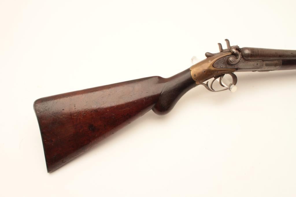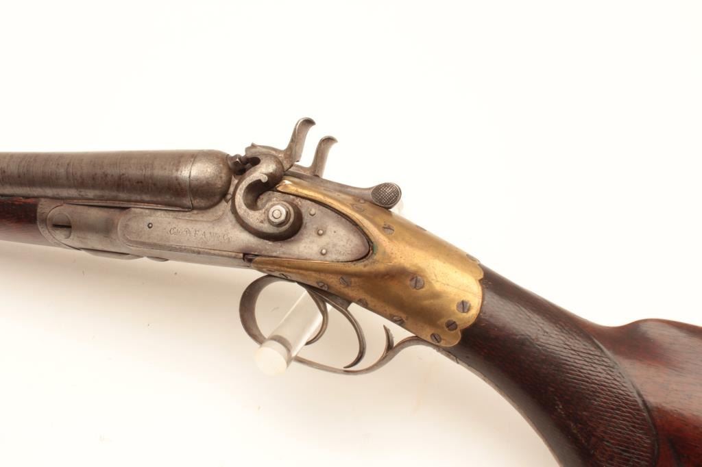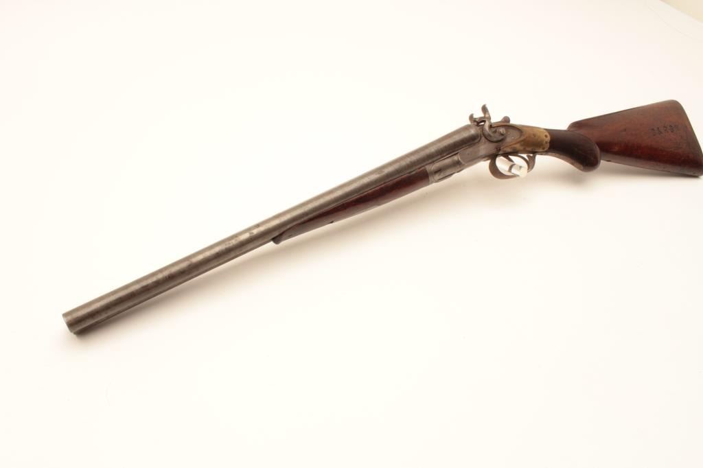 18AP-27 COLT SHOTGUNColt Model 1878 double barrel hammer shotgun, 12 gauge, Serial #11069. The shotgun is in good overall condition with 20” cut down Damascus barrels. The barrels are a grey patina with a steel bead front sight. Thereceiver is a silver/grey patina and the Colt markings are sharp. The checkered wood stock has an interesting repair or reinforcement at the wrist. A brass sleeve has been attached to strengthen the stock.The wood is in good condition with mars and compressions consistent with carry and use. The butt stock ends with a smooth steel butt plate. The shotgun features double trigger and a splinter fore end. Of note, the buttstock is marked, “D & RGW” on the left side of the butt stock for the Denver and Rio Grande Western Railroad. Est.: $400-$800. (Antique).Colt Model 1878 double barrel hammer shotgun, 12 gauge, Serial #11069. The shotgun is in good overall condition with 20” cut down Damascus barrels. The barrels are a grey patina with a steel bead front sight. Thereceiver is a silver/grey patina and the Colt markings are sharp. The checkered wood stock has an interesting repair or reinforcement at the wrist. A brass sleeve has been attached to strengthen the stock.The wood is in good condition with mars and compressions consistent with carry and use. The butt stock ends with a smooth steel butt plate. The shotgun features double trigger and a splinter fore end. Of note, the buttstock is marked, “D & RGW” on the left side of the butt stock for the Denver and Rio Grande Western Railroad. Est.: $400-$800. (Antique).