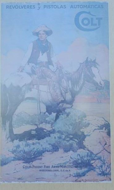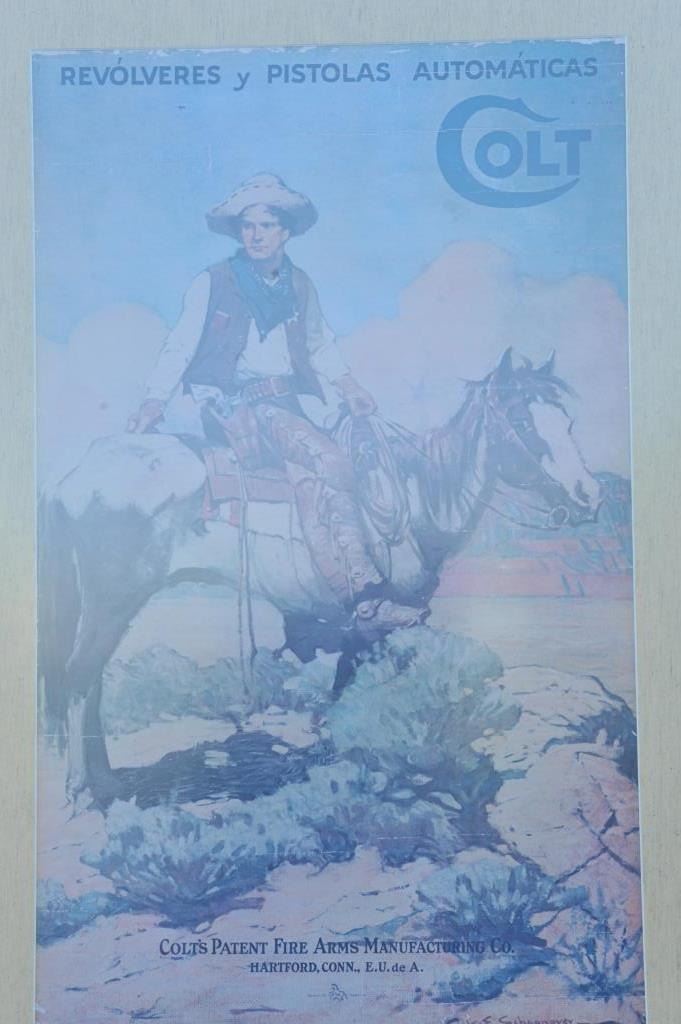 18AP-68 TEX AND PATCHESFramed and matted copy of the famous Colt’s advertiser “Tex and Patches”, in Spanish; approximately 44” x 31” overall; a great decorator for the gunroom. Est.: $300-$600.Framed and matted copy of the famous Colt’s advertiser “Tex and Patches”, in Spanish; approximately 44” x 31” overall; a great decorator for the gunroom. Est.: $300-$600.
