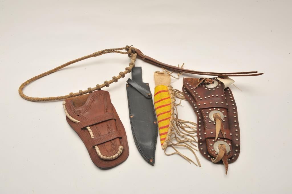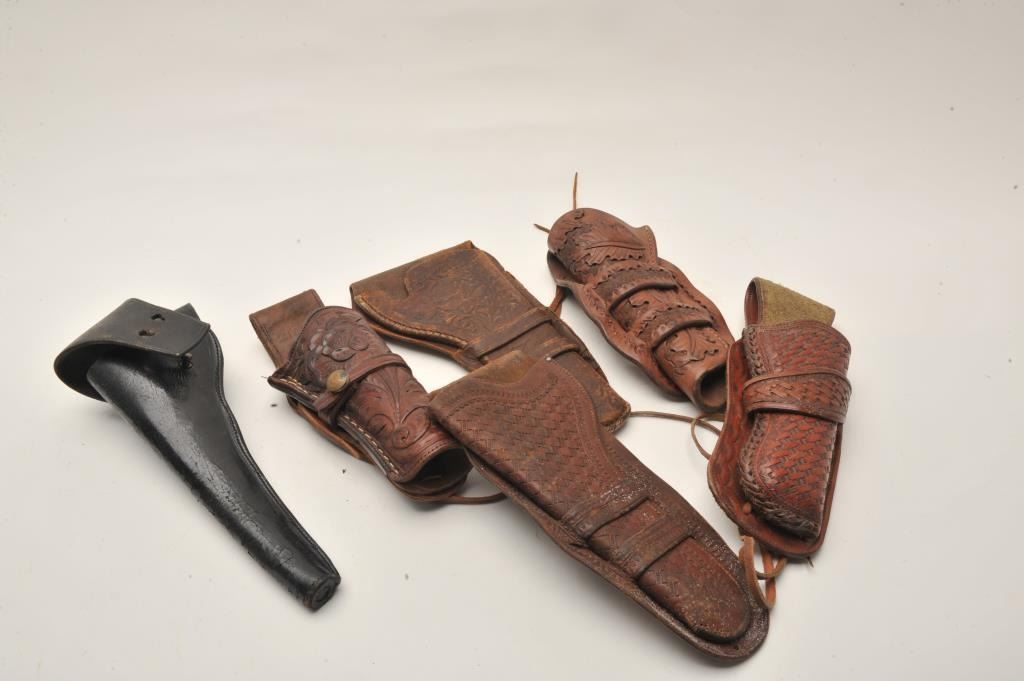18AP-95 HOLSTER LOTBonanza lot of Western leather of varying age, approximately 26 holsters, 6 holster rigs, 1 pair of old saddlebags and 1 quirt; a great array of items with some maker-marked! Est.: $300-$500.Bonanza lot of Western leather of varying age, approximately 26 holsters, 6 holster rigs, 1 pair of old saddlebags and 1 quirt; a great array of items with some maker-marked! Est.: $300-$500.