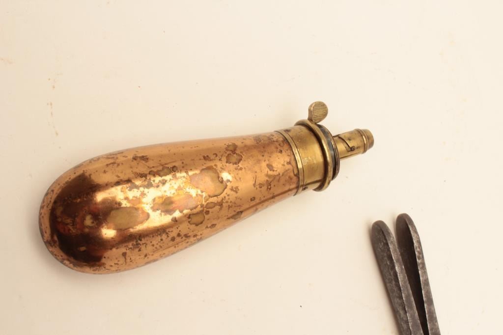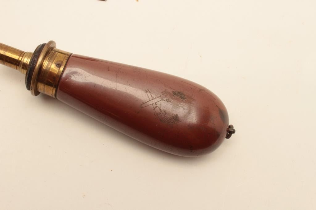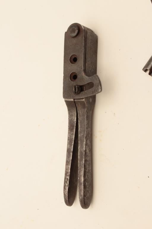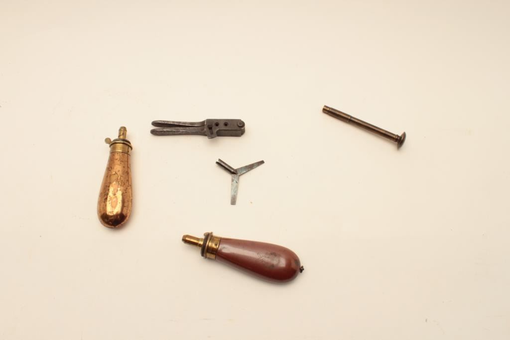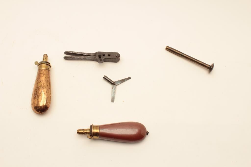 18AL-75 MISC. LOTPercussion accessories lot including an English Sykes brass bag mold, a Dixon brass bag mold, a brass loading tool, an iron Colt’s Patent bullet mold and a non-Colt nipple wrench/screwdriver. Est.:$300-$600.Percussion accessories lot including an English Sykes brass bag mold, a Dixon brass bag mold, a brass loading tool, an iron Colt’s Patent bullet mold and a non-Colt nipple wrench/screwdriver. Est.:$300-$600.
