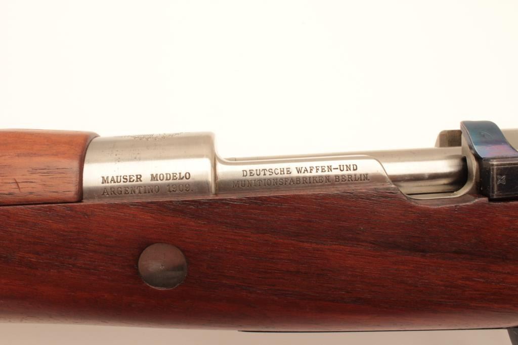 17MH-18 ARGENTINE DWM MAUSER #E5516Argentine Mauser by DWM, Model 1909 bolt action rifle, 7.65mm caliber, military finish, wood stock, with bayonet and sheath, S/N E 5516, in overall very good to fine condition with very good bore, majority ofmilitary finish remaining, near fine stock, muzzle cover; fine bayonet and sheath. (C&R/PPT). Est.: $500-$1,000.Argentine Mauser by DWM, Model 1909 bolt action rifle, 7.65mm caliber, military finish, wood stock, with bayonet and sheath, S/N E 5516, in overall very good to fine condition with very good bore, majority ofmilitary finish remaining, near fine stock, muzzle cover; fine bayonet and sheath. (C&R/PPT). Est.: $500-$1,000.