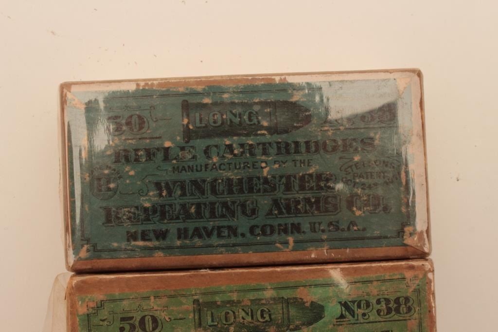 18AL-9 2 BOXES .38 LONG RIMLot of 2 boxes of antique collectible ammo, both by Winchester Repeating Arms Co., Stetson’s Patent/Oct. 24, 1871, .38 Long R.F. caliber, one with blue No. 38 label, one with green No. 38 label. Est.:$150-$300.Lot of 2 boxes of antique collectible ammo, both by Winchester Repeating Arms Co., Stetson’s Patent/Oct. 24, 1871, .38 Long R.F. caliber, one with blue No. 38 label, one with green No. 38 label. Est.:$150-$300.