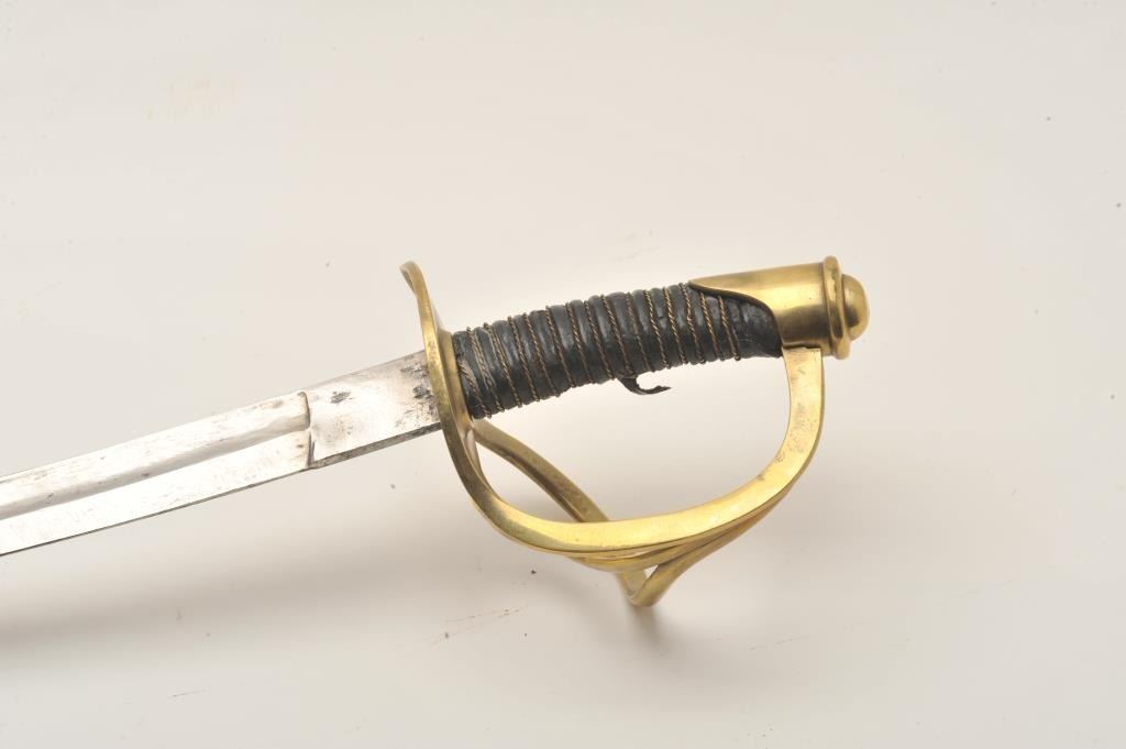 18AR-6 D GUARD SWORDEtched blade brass “D” guard sword (no scabbard), approximately 37” overall with a 31” blade, wire wrapped grip showing some damage; overall fair to good condition. Est.: $100-$200.Etched blade brass “D” guard sword (no scabbard), approximately 37” overall with a 31” blade, wire wrapped grip showing some damage; overall fair to good condition. Est.: $100-$200.